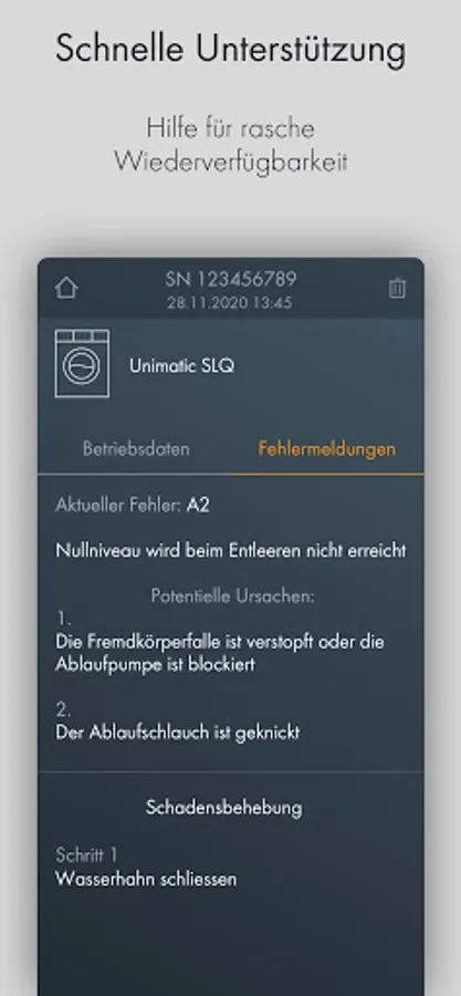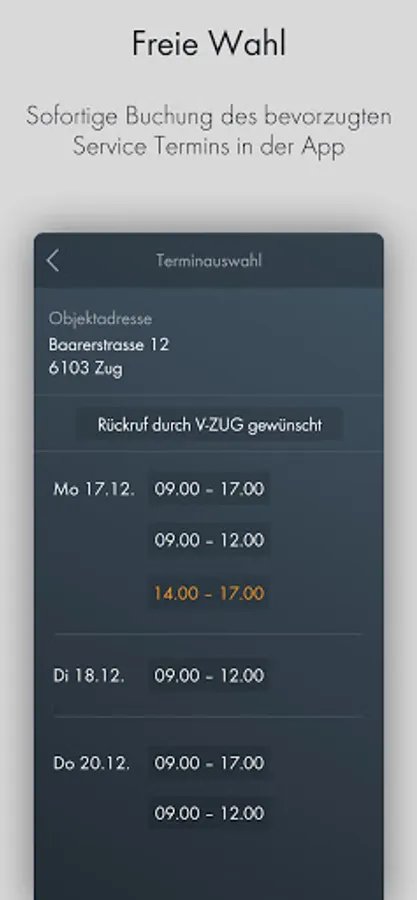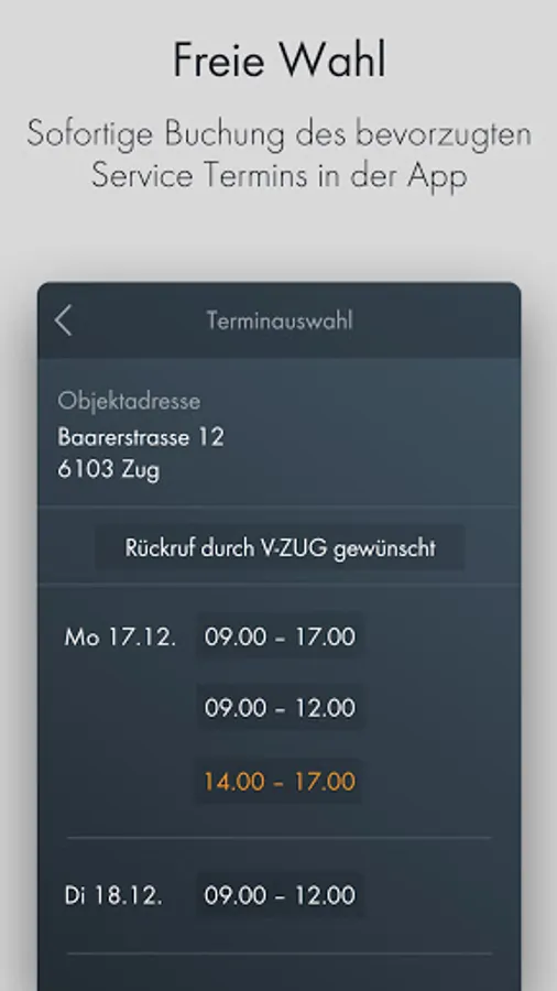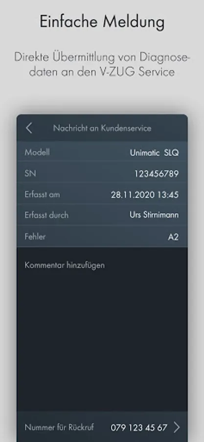 V-Connect reads data from the household appliance, shows it to you in the app and also transmits it to the V-ZUG service. This data enables conclusions to be drawn about sources of error and supports the service technician in preparing and carrying out the service work. The digital appointment arrangement enables you to make a binding booking of an on-site visit by our V-ZUG service.