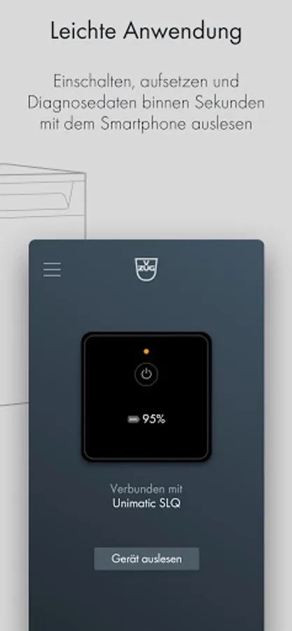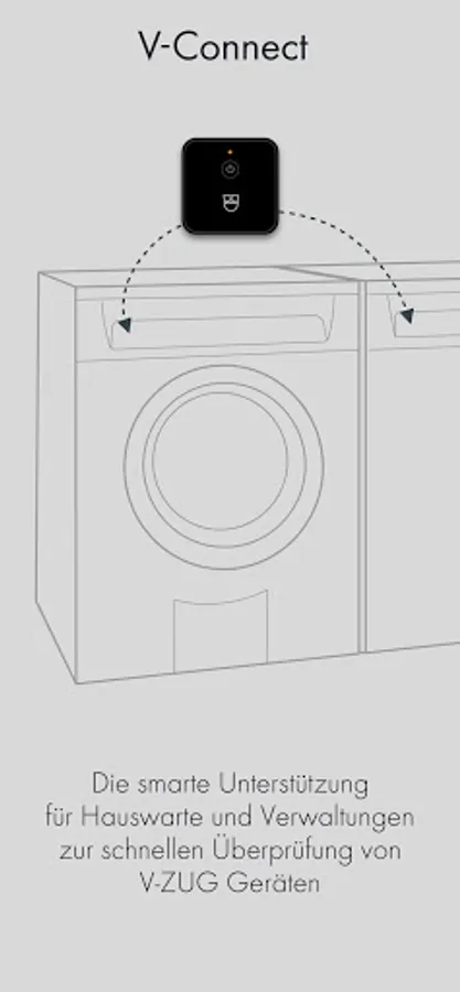 The functional scope of V-Connect is currently only available to administrations and their caretakers supported by V-ZUG Service. Use of the app requires a login approved by V-ZUG and the V-Connect button.