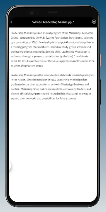 Leadership Mississippi is an annual program of the Mississippi Economic Council conducted by the M.B. Swayze Foundation. Participants, selected by a committee of MEC’s Leadership Mississippi Alumni, work together in a training program that combines individual study, group sessions and project experience in using leadership skills. Leadership Mississippi is endowed through a generous contribution by the late J.C. and Annie Redd. J.C. Redd was Chairman of the Mississippi Economic Council in 1973-74 when the program began.