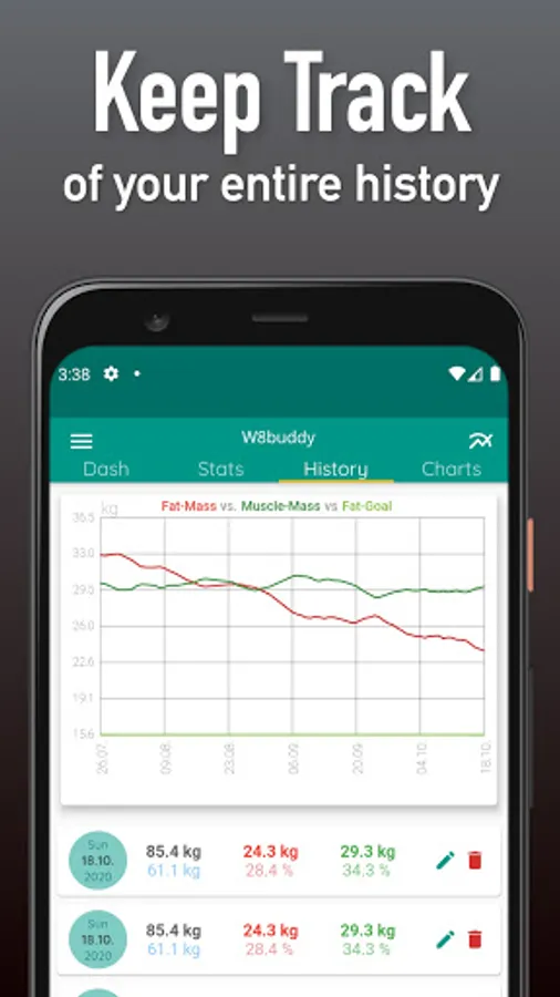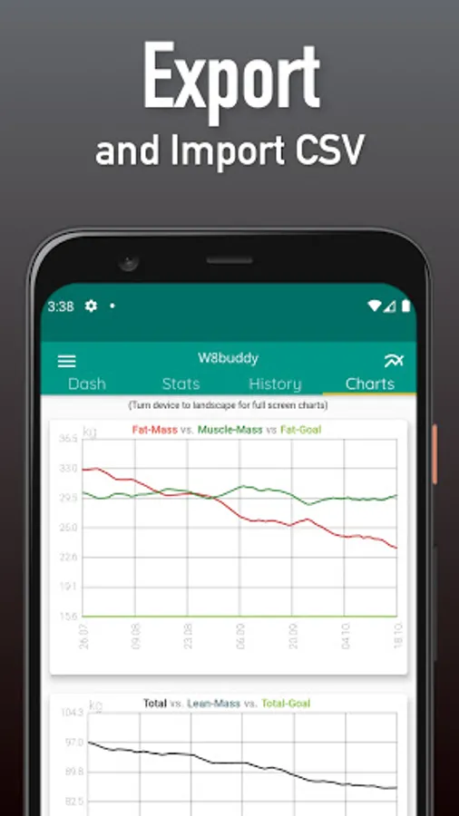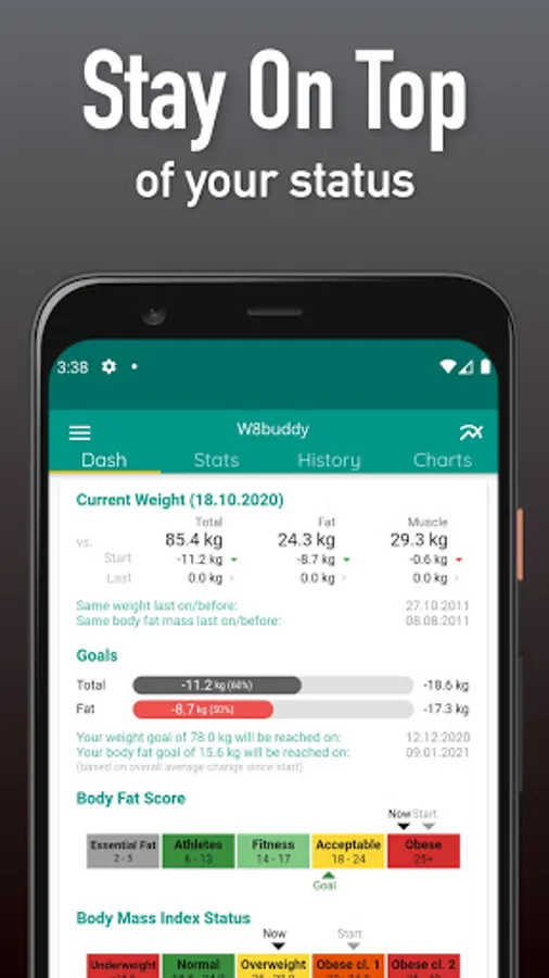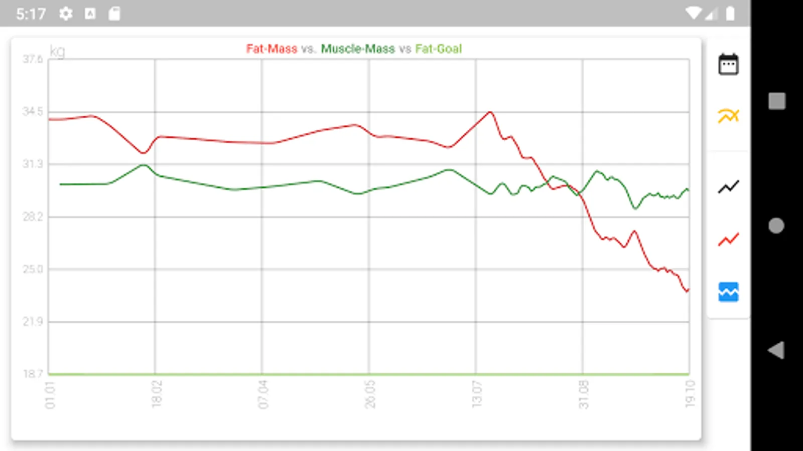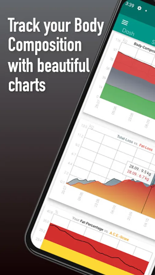 Analyze your progress and change in body composition with specialized charts that actually make use of the information instead of just showing the measurements independently like many other apps do.