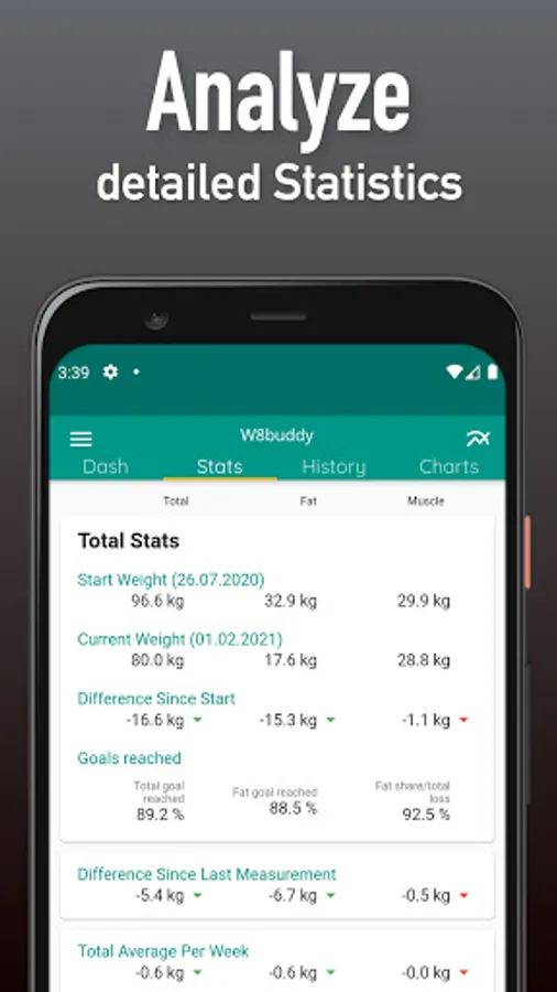 Set goals, analyze your progress and see what your average change is, last 7 days, last 30 days and get a projection of when you will reach your goals approximately.