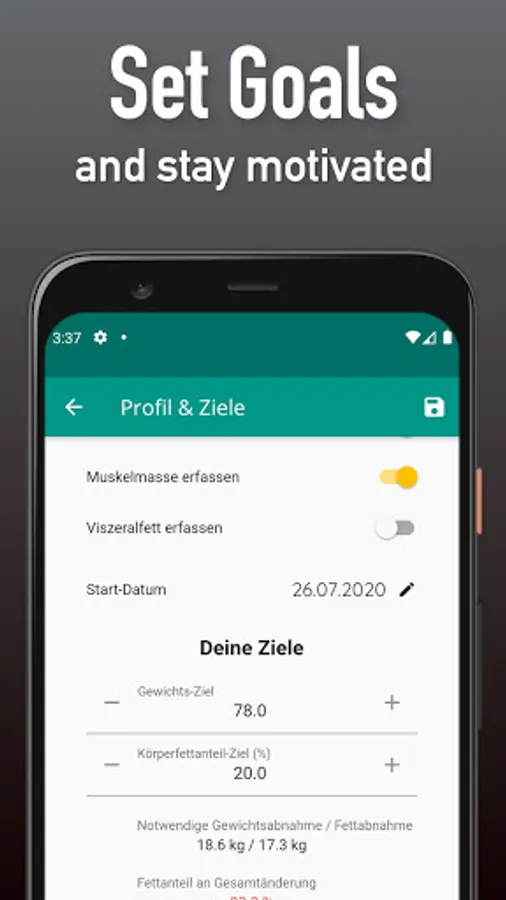 Don't just track your weight but more importantly track your body, muscle mass and visceral fat (all optional) and calculate your BMI.