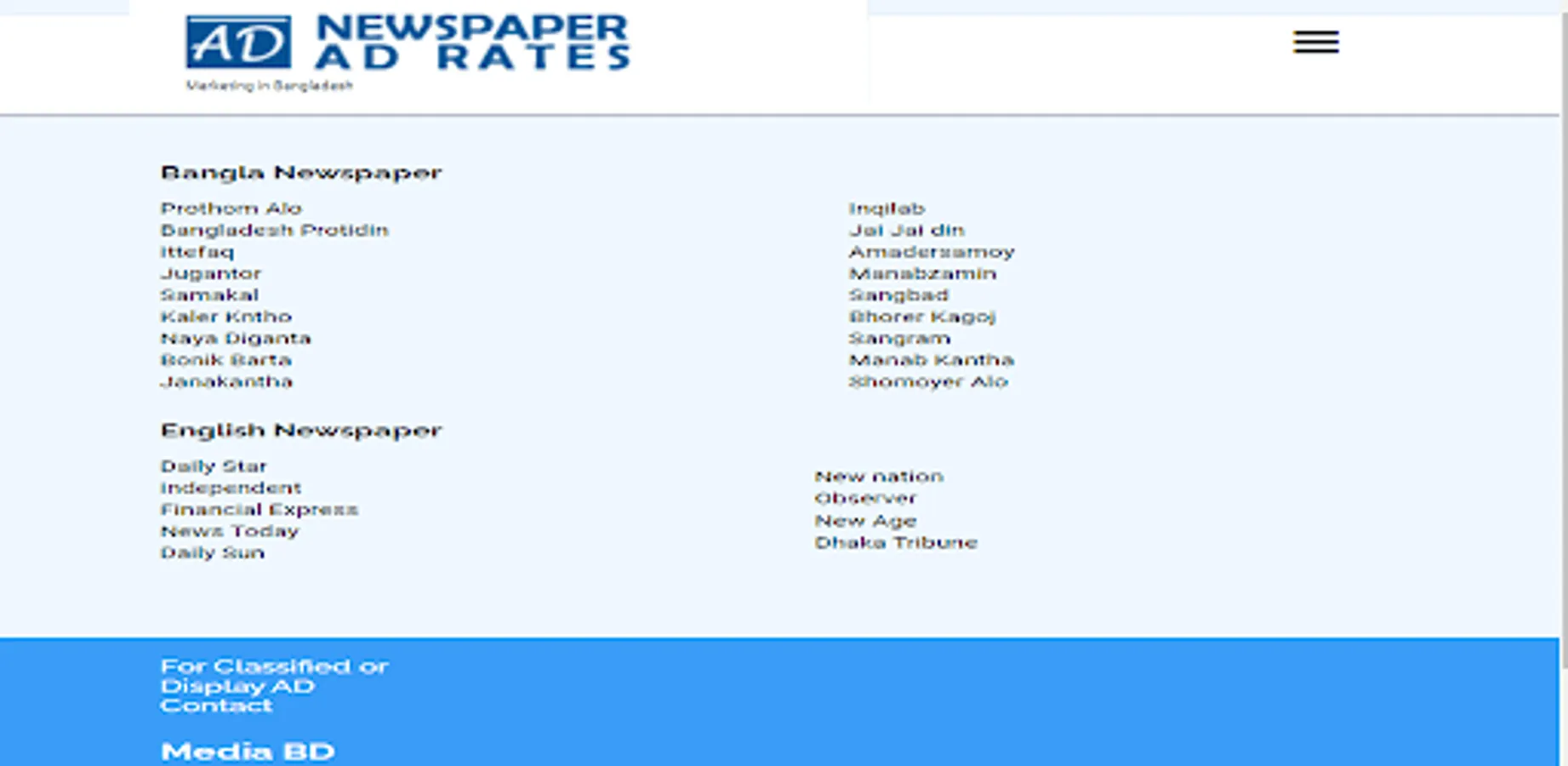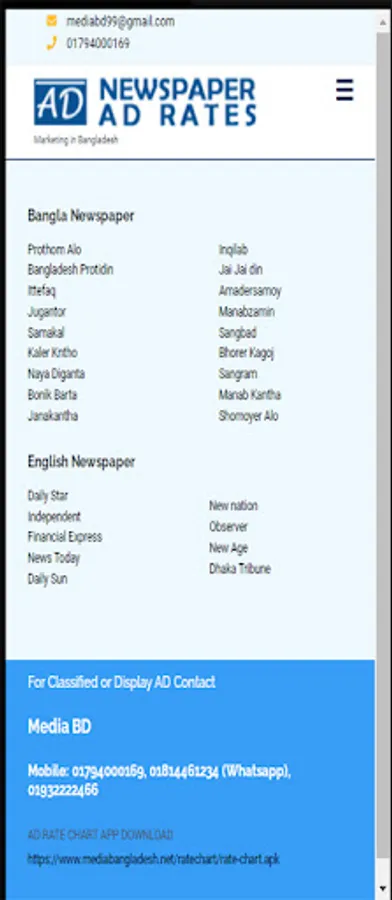 This Ad Rate app will help you to know all newspapers advertisement price, size, color, page and other information. The Ad Rate app listed most of the newspaper in Bangladesh in Bangla and English.