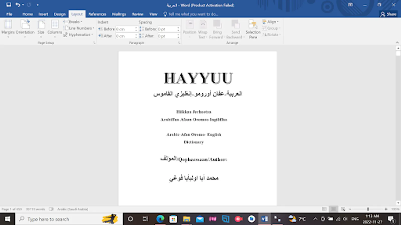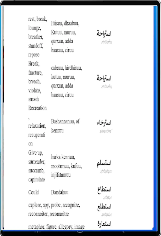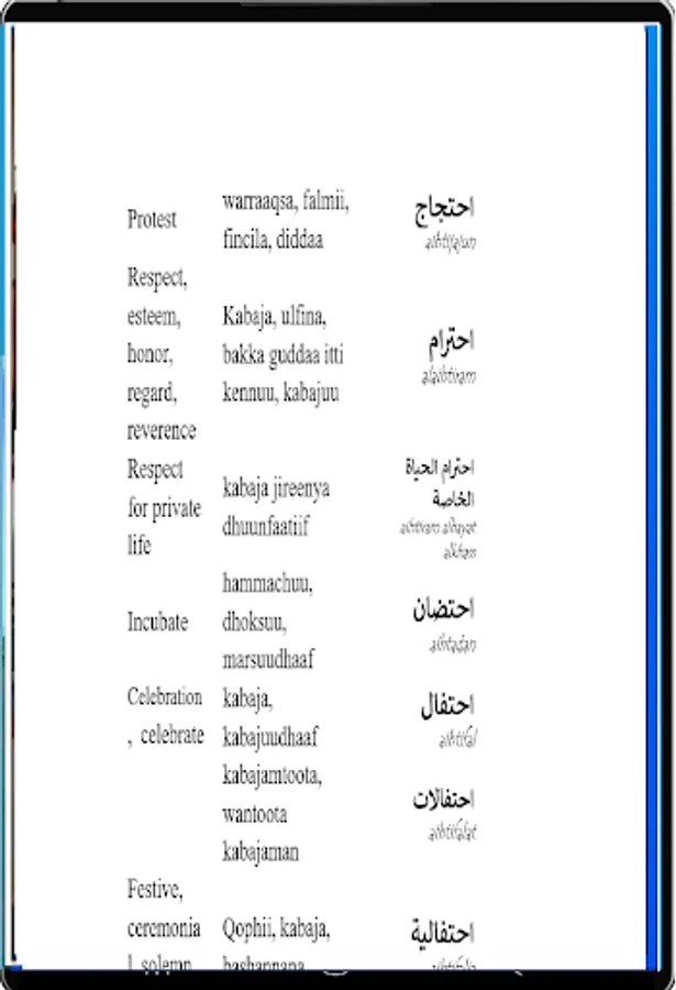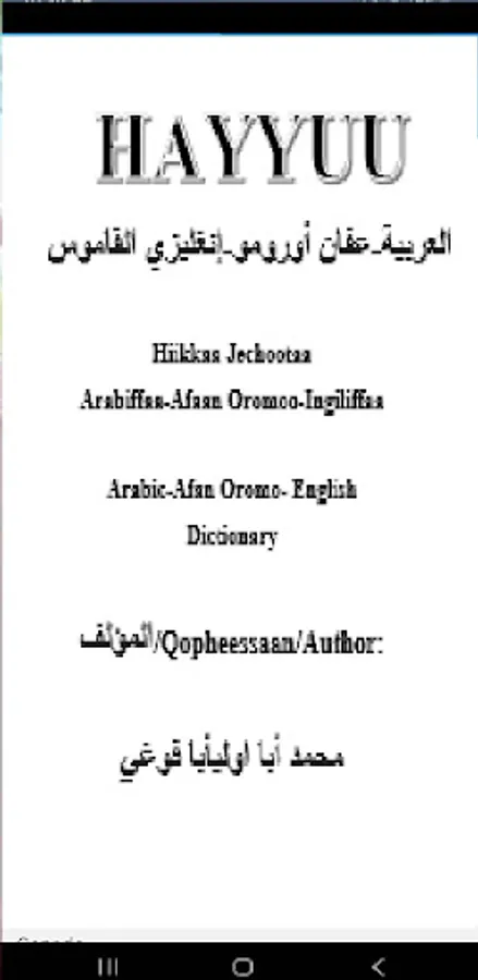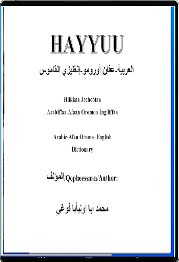 HAYYUU Arabic- Afan Oromo- English dictionary is bringing Afan Oromo to the horizon of the speakers! This Dictionary has more than 40,000 Arabic words translated into Afan Oromo and English languages with examples. It was the biggest and largest books in Arabic- Afan Oromo- English version.