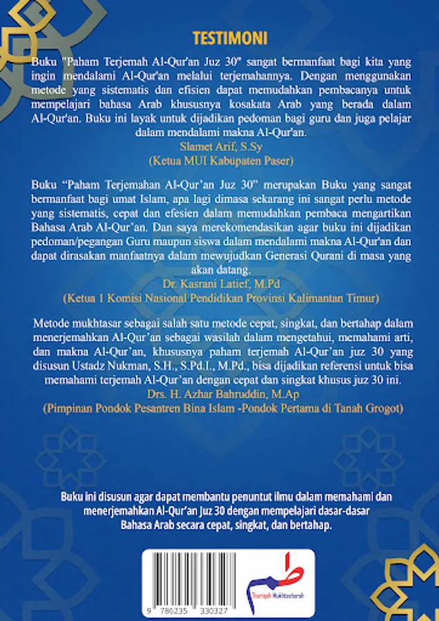 Understanding the Translation of the Al-Qur'an Juz 30 The Mukhatashar Method is an Arabic Learning Book based on the translation of the Koran Juz 30 per word by simplifying Arabic theories and the meaning of the vocabulary of the Qur'an and its translation. Where learning is focused on understanding the translation of Arabic into Indonesian on the Al-Qur'an Juz 30, making it easier for beginners to understand the Qur'an with an understanding level that reaches 85% -95%.