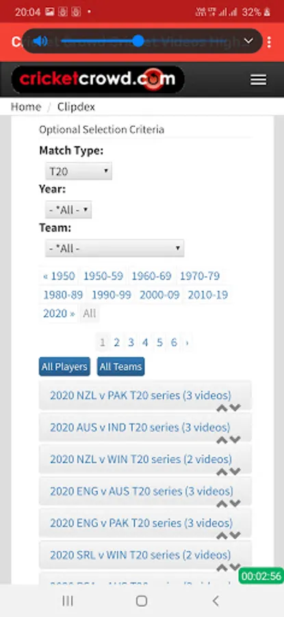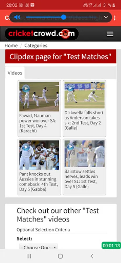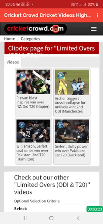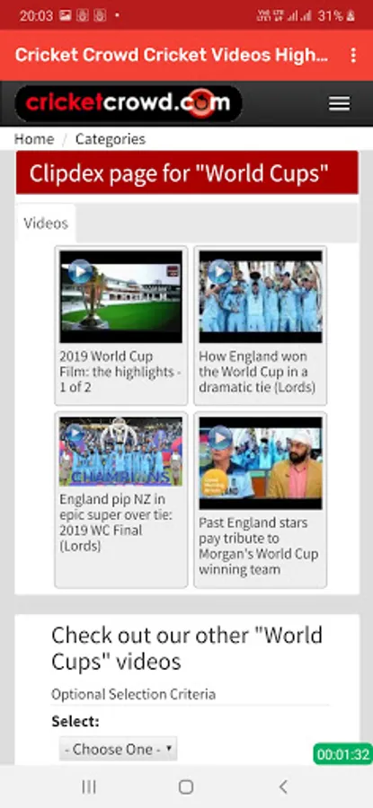 *Categories for Videos such as Test, ODI, T20, ICC Tournaments and Cricket Player Performances