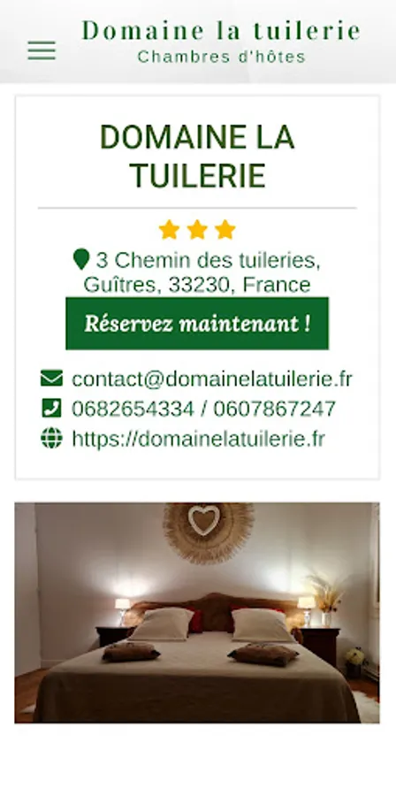 Bienvenue au Domaine la Tuilerie, nous vous proposons nos chambres d'hôtes avec accès piscine, au centre d'un parc naturel ombragé de 2,2 ha. Situé à Guîtres à 1km du bourg et proche du libournais et de la célèbre ville médiévale de Saint Emilion, le domaine vous enchantera. Accordez-vous une pause détente et bien être lors d'une escapade à la campagne, en pays de Guîtres, hors du temps et loin
