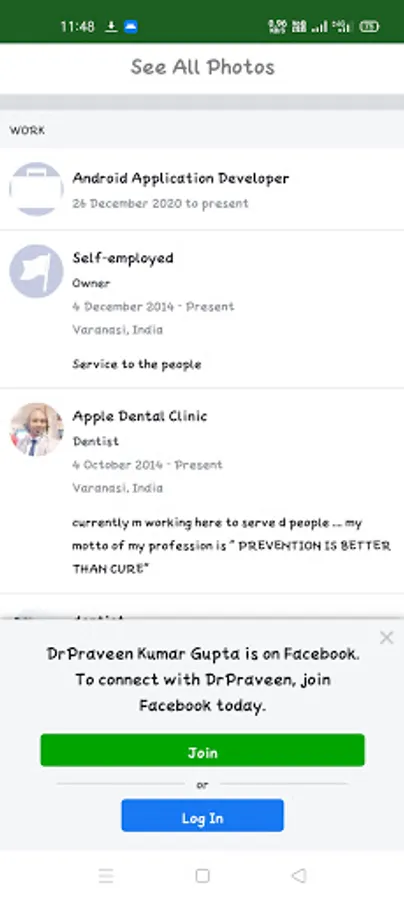 In this application it is my facebook page ,you can log in to Facebook and view your profile,or make your account on Facebook.! this is Dr Praveen Kumar Gupta from varanasi,I have passed my dentistry from bharati Vidyapeeth University dental college navi mumbai since 2012, currently I live in varanasi and owner of my clinic. I am running Apple Dental clinic since 2014 and facing many patients per day.in my cases pyorrhoea is the main disease ( tooth mobility,gum bleeding,and bad odours), second type of cases include cavity, caries, pulp damage, and many more.i make tooth and tooth supporting bridge and acrylic denture, per day.
