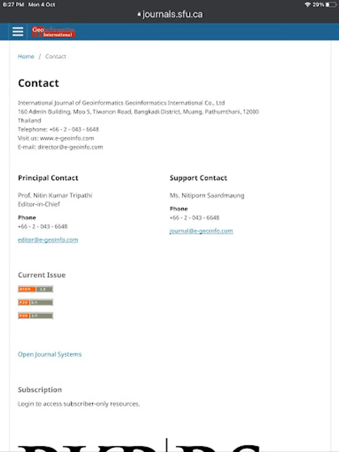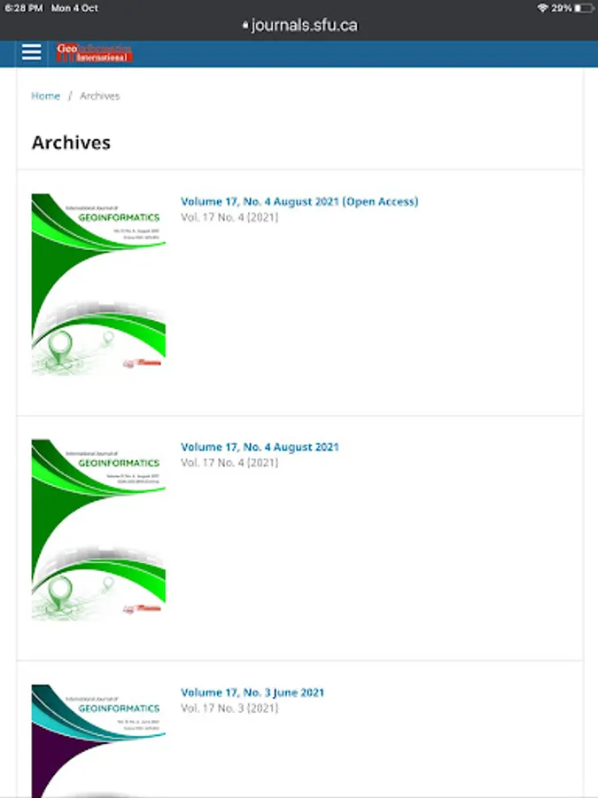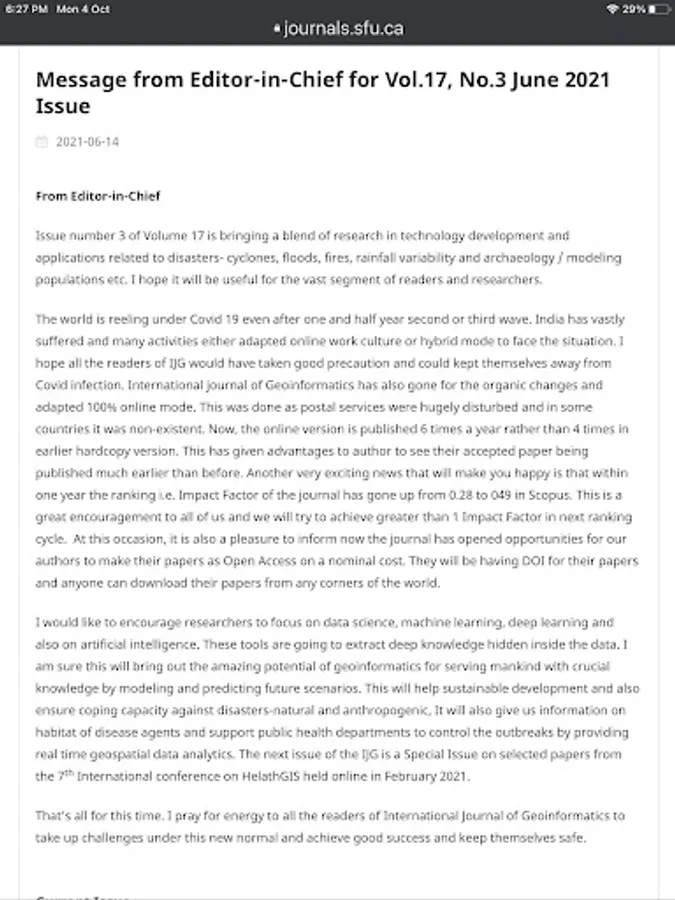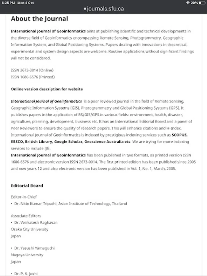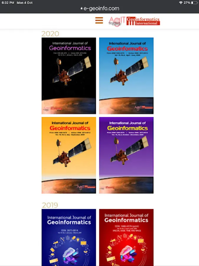 International Journal of Geoinformatics is a peer-reviewed journal in the field of Remote Sensing, Geographic Information Systems (GIS), Photogrammetry and Global Positioning Systems (GPS). It publishes papers in the application of RS/GIS/GPS in various fields: environment, health, disaster, agriculture, planning, development, business etc. It has an International Editorial Board and a panel of Peer Reviewers to ensure the quality of research papers. This will enhance citations and H-Index. International Journal of Geoinformatics is indexed by prestigious indexing services such as SCOPUS, EBSCO, British Library, Google Scholar, Geoscience Australia etc. We are trying for more indexing services to include IJG. International Journal of Geoinformatics is accessible online with ISSN 2673-0014.