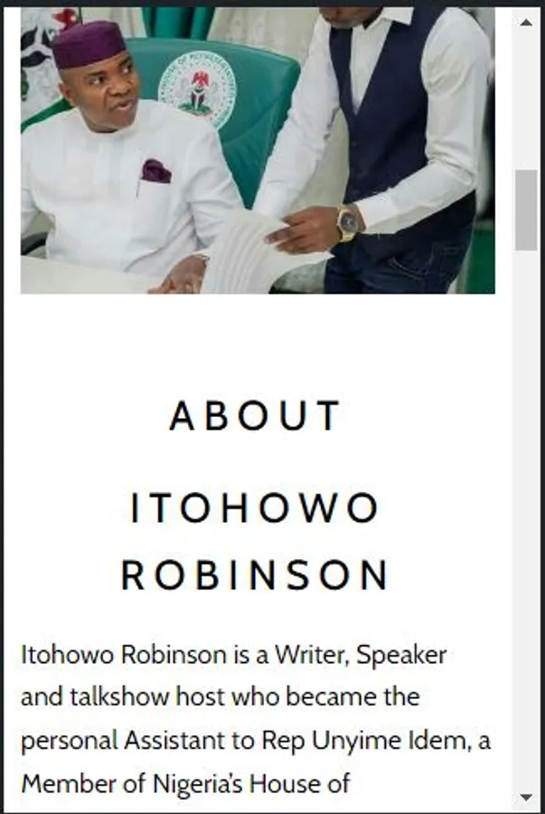 Itohowo Robinson is a Writer, Speaker and talkshow host who became the personal Assistant to Rep Unyime Idem, a Member of Nigeria’s House of Representatives.