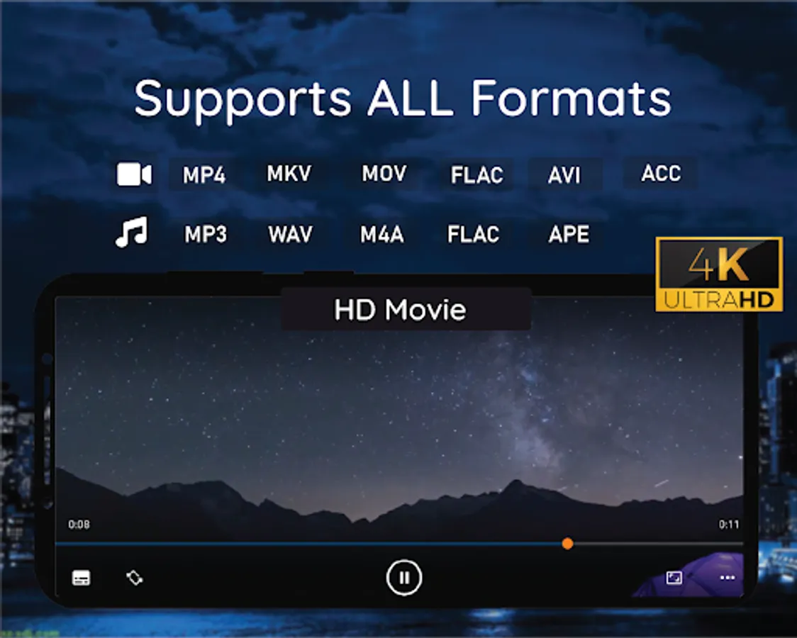 Playing audio and video files is the core function of all media players (especially Medi Player). Obviously, but many movie and music players cannot play certain types of file formats. If you have ever encountered a situation where you downloaded a video or audio file to your phone and couldn't open it, the current media player may be disappointing. Medi Player supports multiple file formats and includes all codecs, which greatly enhances compatibility.