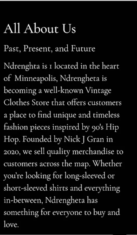 NDrengheta Clothing is a designer clothing line. We specialize in making clothes that are mostly unisex. You can find us on Facebook, Instagram, Twitter and You Tube. We are a Minneapolis MN. USA based company. We ship to anywhere in the United states. We have been in business for 3 years. We are an online shop. Our designs are limited editions. We only sell about a specific number of designs before retiring them completely. NDrenegheta Clothing is part of the MySwitchport.com family of websites and apps. Be sure to download all or apps by searching "MySwitchport.com" in the Google Play Store and check out our developer account for a complete listing of all of our apps.