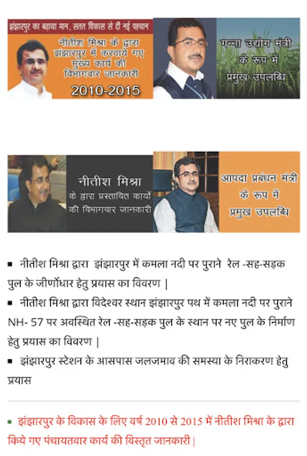 Nitish Mishra, is Vice President, BJP Bihar and a Former Minister in the Government of Bihar, (Sugarcane Development, Disaster Management & Rural Development: November 2005 - February 2015). He has more than 24 years of experience. Contested five consecutive Bihar Assembly Elections from 2000 upto 2015 from Jhanjharpur Assembly Constituency (District - Madhubani) and Member 13th, 14th and 15th Bihar Vidhan Sabha.