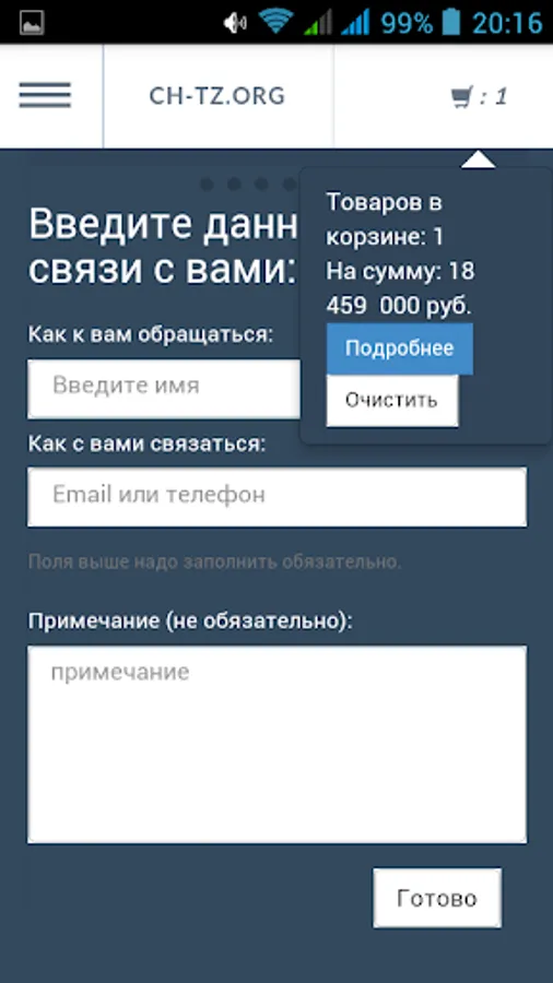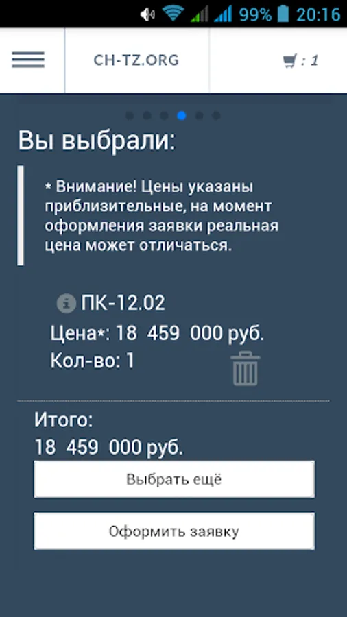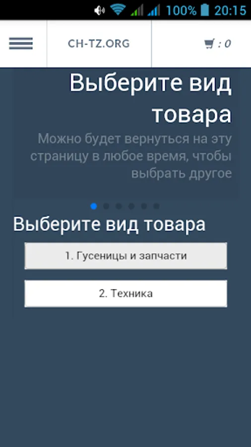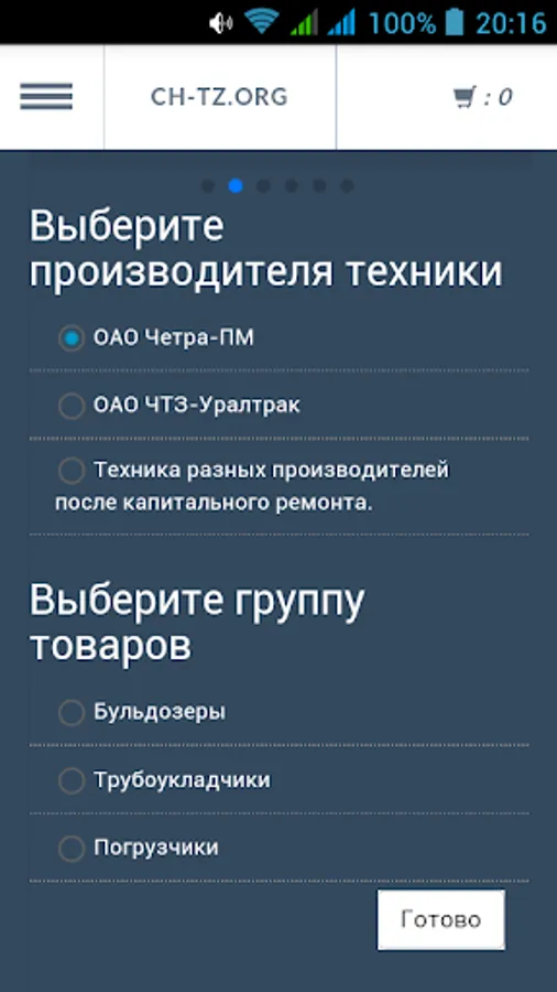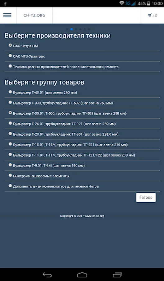 This application is created as part of the online store Ltd. "ChebTraktorZavod". The app helps you choose from a list of equipment and spare parts for manufacturers and place an order.