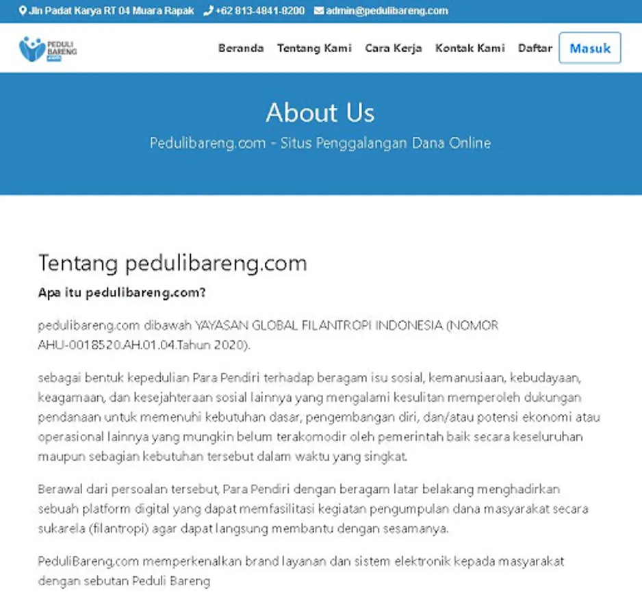 pedulibareng.com under FOUNDATION GLOBAL PHILANTROPY INDONESIA (NUMBER AHU-0018520.AH.01.04.Tahun 2020).
