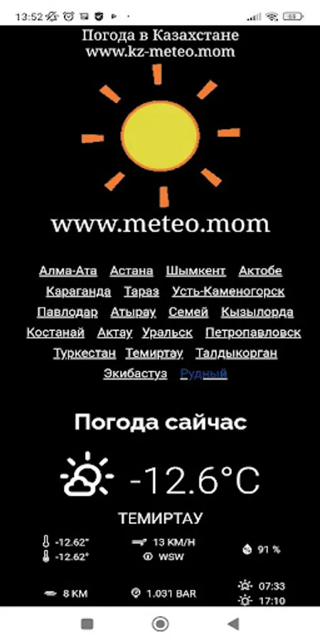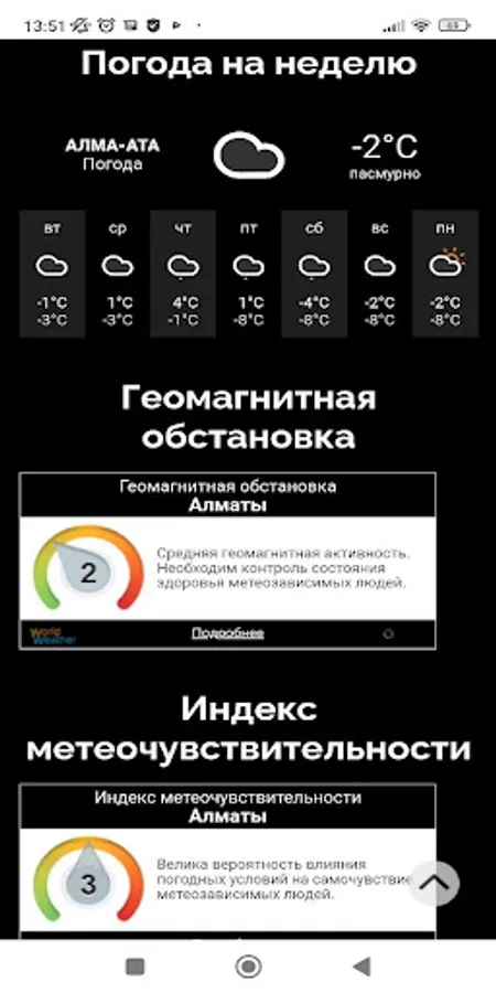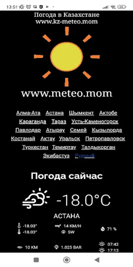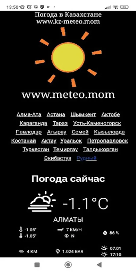 Weather in Kazakhstan is a free mobile weather app with an ergonomic and modern design for maximum usability and readability of weather information.