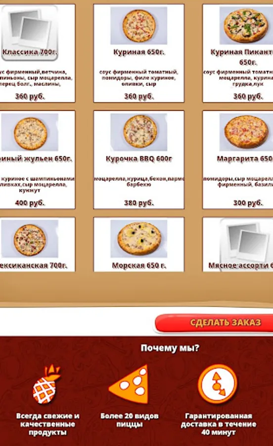 For pizza we always use only fresh and high-quality products. More than 20 types of pizza for every taste. Delivery