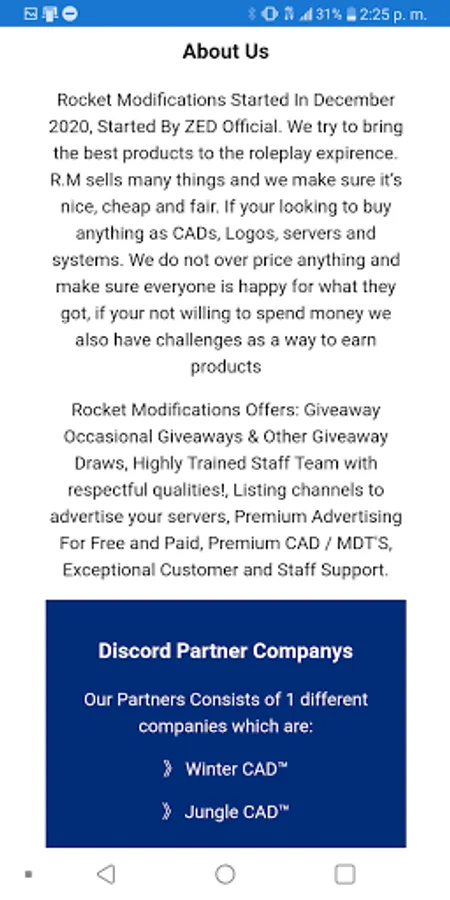 Rocket Modifications is a mini business in discord the is dedicated to bringing the best products to our customers, like CAD/MDT, Websites and Webhosting, and more, all of our products are of the best quality we can make and bring to our customers.
