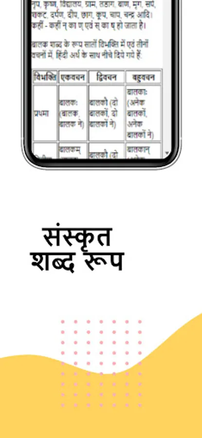 This app is loaded with all important Sanskrit Shabd roop in all vibhakti and vachans with Hindi meaning. Our aim is to make it easier for students to learn all the important Sanskrit Shabd roop and understand the meaning of each word used in Sanskrit shabd roop in Hindi.