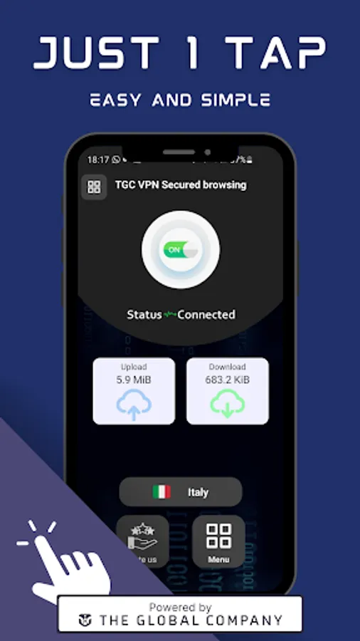 1. Just 1 tap - our app is super easy to use, just tap on or off to activate your VPN features.
