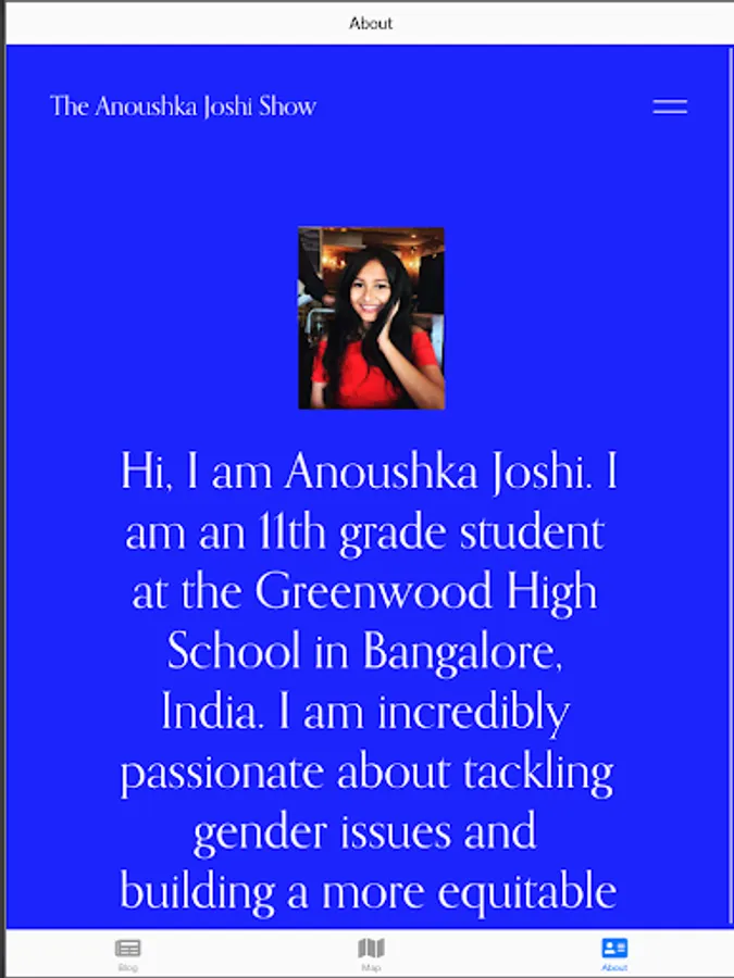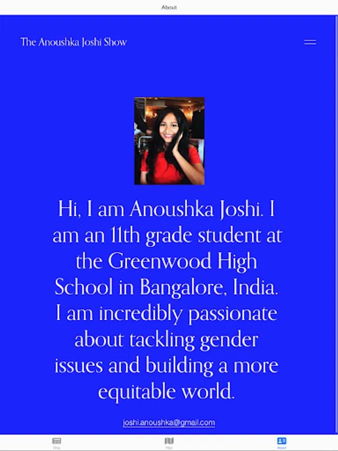 Welcome to my very own platform called “The Anoushka Joshi Show” where I routinely interview the world’s coolest women. I collect their stories, so we can all be inspired by them. I have interviewed everyone, from professors at UC Berkeley to the two founders of one of India’s largest foundations, from top fashion designers of the country to professors at Stanford, and I love interviewing them! I want “The Anoushka Joshi Show” to be a corpus of inspiration, available to everyone for free. I ask these inspiring women questions about their amazing lives, and what messages they have for all of us. I am also really passionate about supporting women businesses, so on my website, I started plotting businesses owned by women entrepreneurs on Google Maps, so we can all support them.