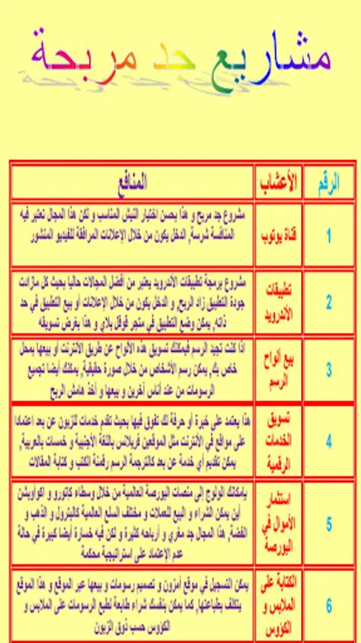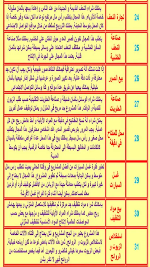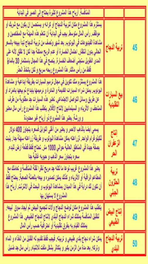 This application is a list of fifty investment projects directed to each person who wants to choose a very profitable project idea and facilitates that. The proposed projects are accompanied by audited explanations of each one. This application helps to define your idea of investing whether you have simple, medium or large capital, and you can find an idea even if you do not have the money provided that you have a craft that you can master. The proposed projects are known and unknown so that some of them require training and Others start from scratch. These profitable projects, some of which are technical and traditional ones, some of which are creative ideas that do not appear to the general public. I am 90 percent sure that you will receive your desired goal and we only ask you to pray when your project succeeds, God willing.