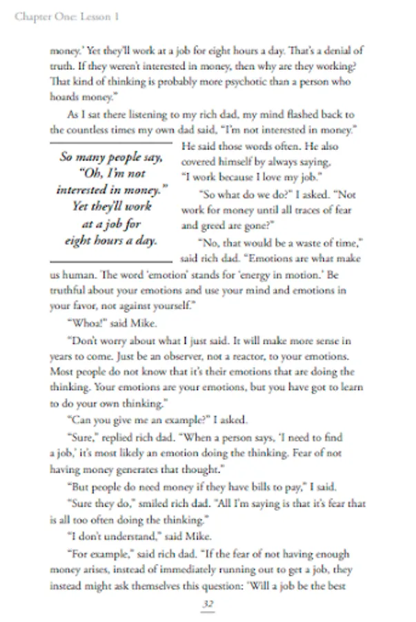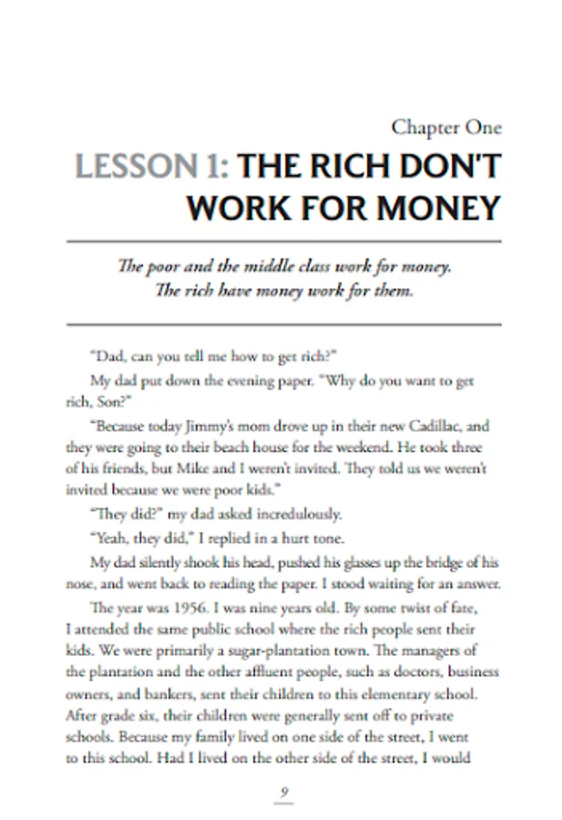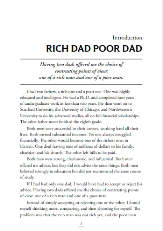 Rich Dad Poor Dad is about Robert Kiyosaki and his two dads—his real father (poor dad) and the father of his best friend (rich dad)—and the ways in which both men shaped his thoughts about money and investing.