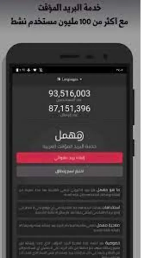 Muhmal is the first Arabic mail service, a temporary email (also known as temporary mail) that allows you to create a specific email with the push of a button. This mail expires after the specified expiration time and you can use it during that time.