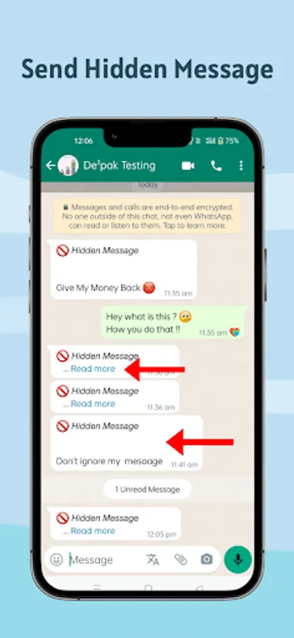 An app to send hidden message on WhatsApp, so that no one can ignore your message. To read your hidden message, receiver must open your chat screen to read your message. Just enter your message and send ...