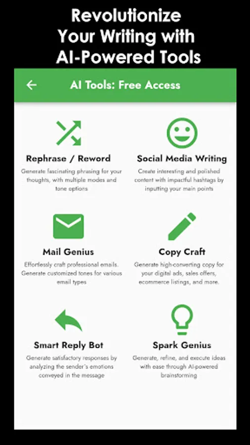 Mail Genius: If you struggle with writing professional emails, this feature is for you. With customized tones for various email types, this tool will help you craft effortlessly professional emails that get results. Whether you're sending an introduction, following up with a client, or sending a job application, this feature will help you make the right impression.