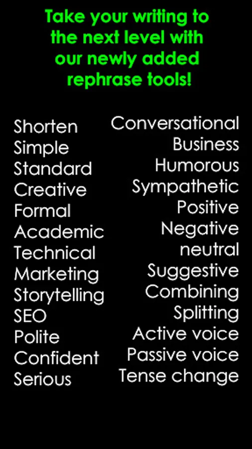 1. Advanced rephrasing capabilities to suggest alternative phrasings for better creativity and formality