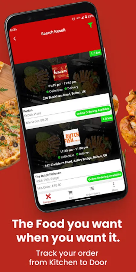 Browse nearby restaurants and search for food by cuisine, restaurant name, dish or meal. Choose from a variety of food to order: Pizza. Burritos. Burgers. Sushi. Chinese food. Skip the line and reservations. Order food using the Takeaways Bolton app now.