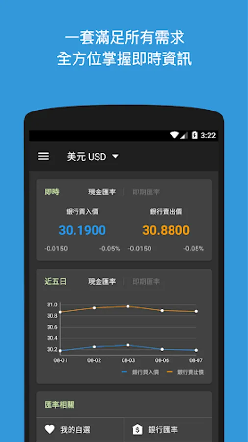 台灣匯率通 提供強大的功能-即時銀行匯率、到價提醒(可指定銀行)、匯率損益試算、匯率換算、今日&歷史匯率走勢圖及數據、國際匯率。