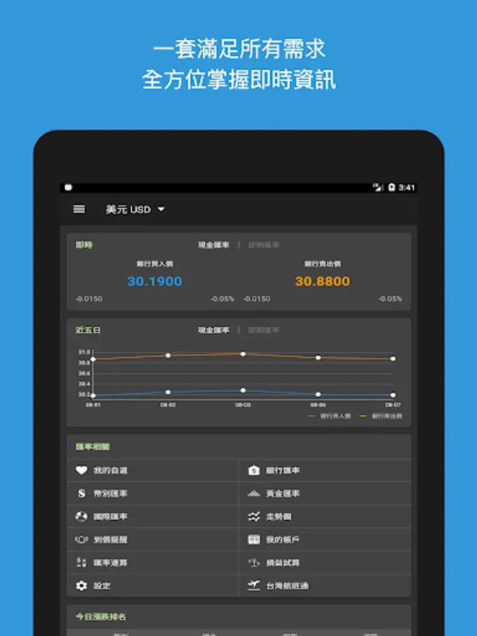 *提供 今日匯率 功能。提供當日銀行匯率走勢圖及數據,讓你更方便今日匯率脈動。