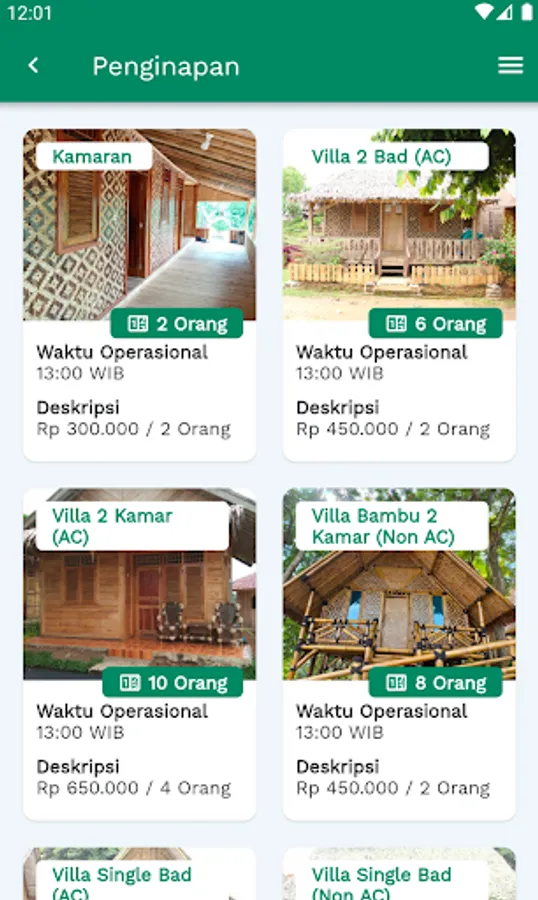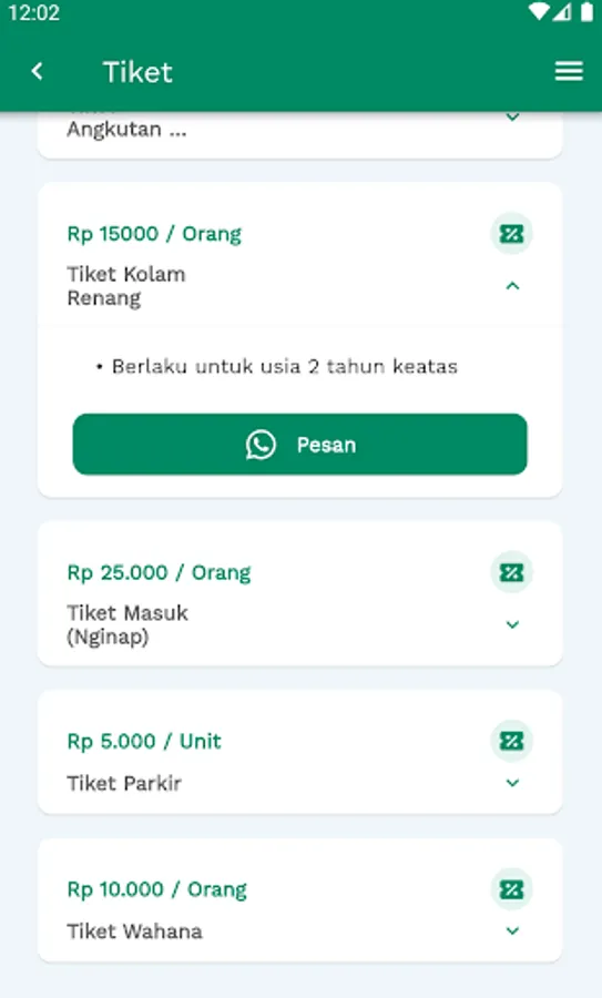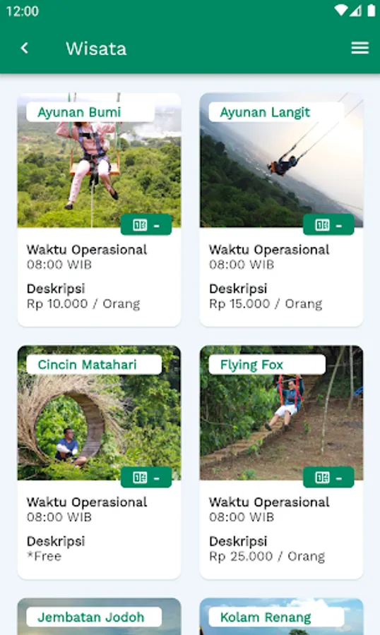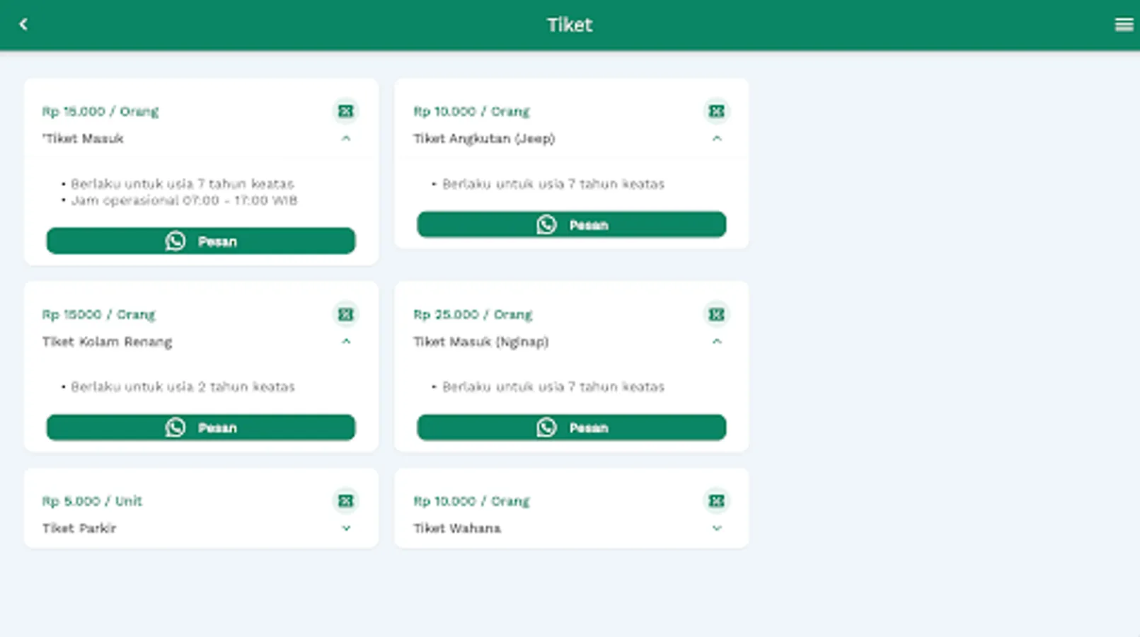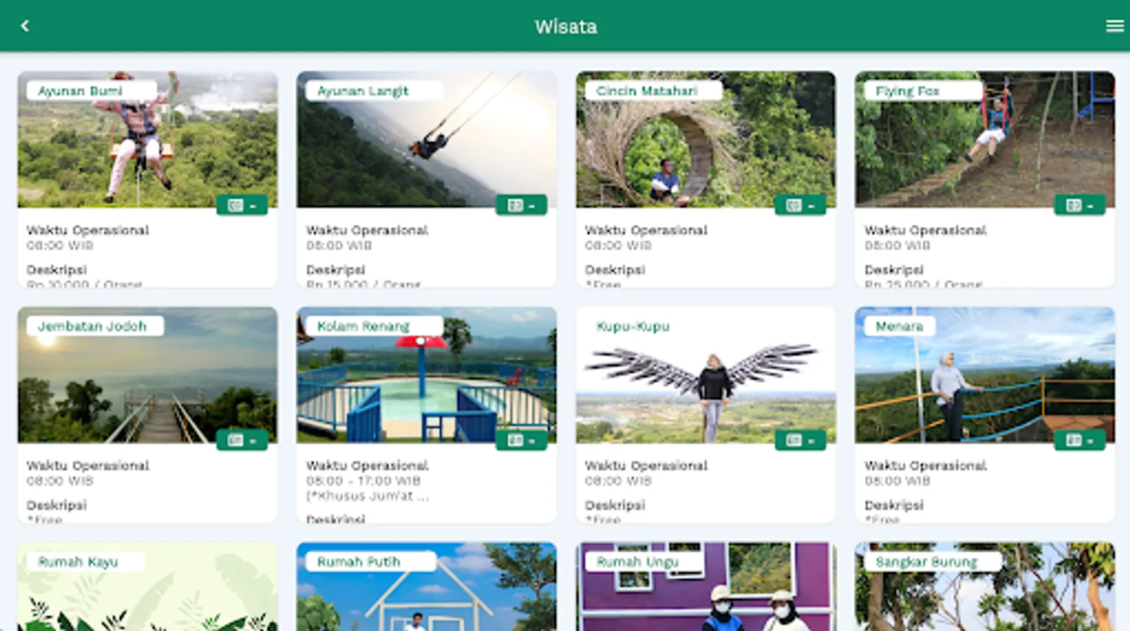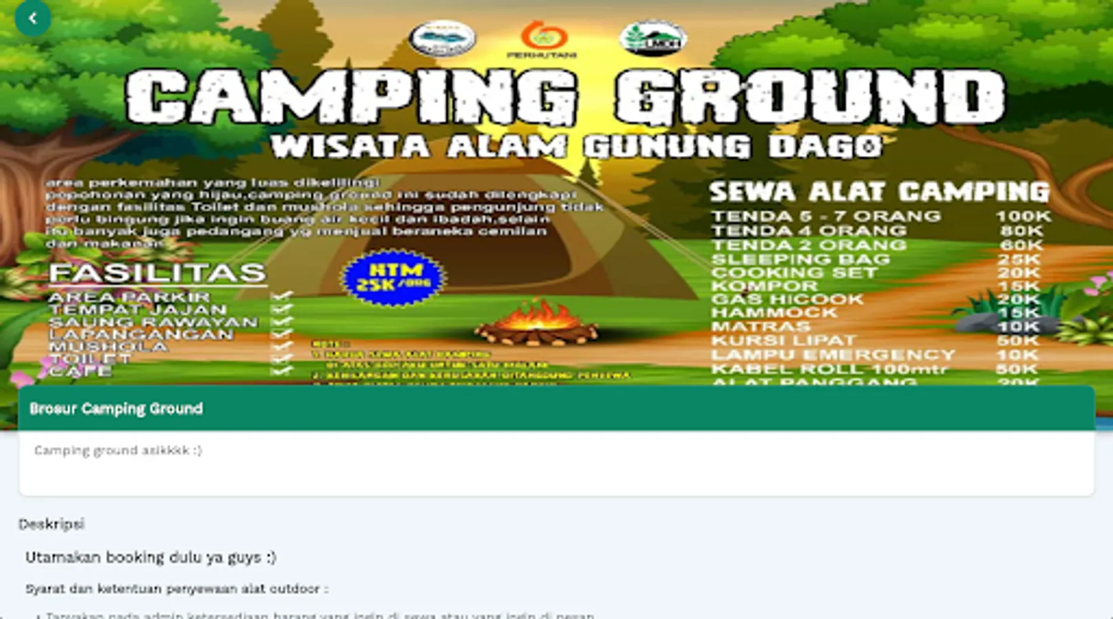 This application contains nature-based tourist rides. The features that are applied include the price of admission tickets, rental prices for lodging, entry prices for swimming pool rides, camper rental prices and prices for other rides such as playing fox. Certain Instagrammable spots are free. In addition to the rides offered, there is also a map to get to Dago's natural attractions.