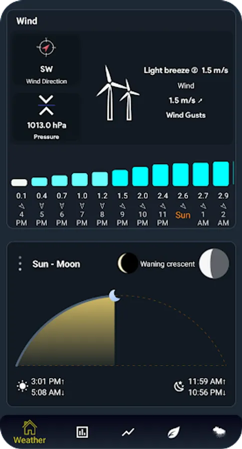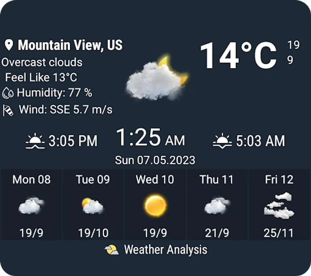 There are many information in weather analysis which includes wind speed and direction through hours and days ,atmospheric pressure, weather condition, visibility distance, relative humidity, precipitation prediction, Sun and Moon rise and set.