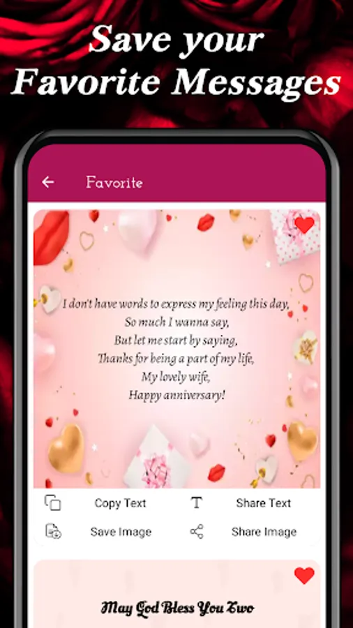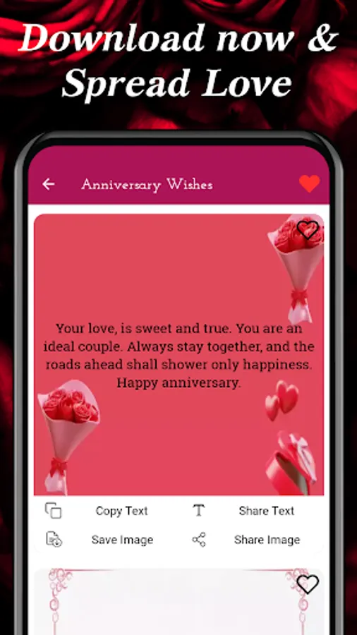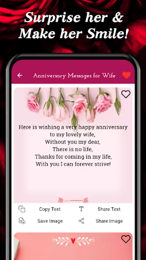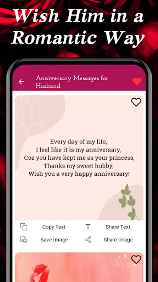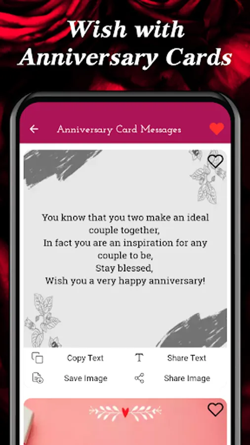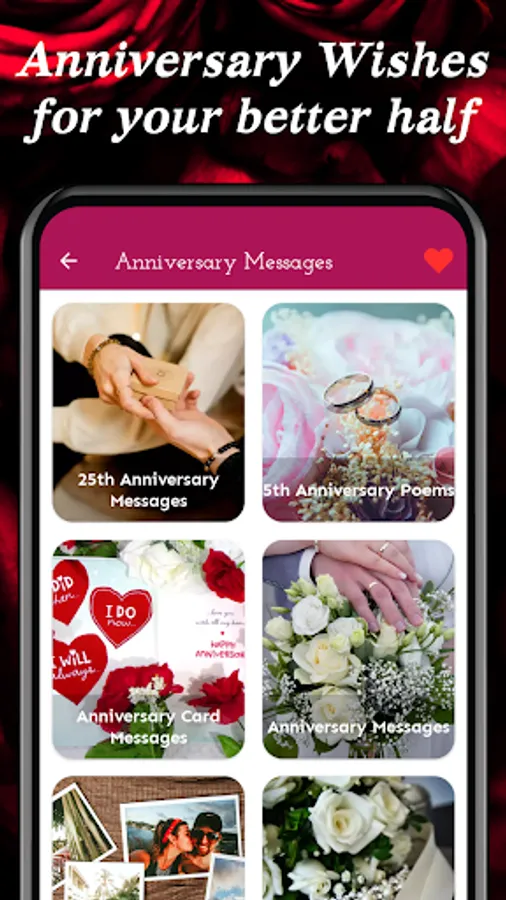 Discover tons of anniversary wishes for husband, 25th anniversary messages, wedding anniversary wishes, and poems that will convey precisely what you feel in your heart. this is the only app you will ever need to find the most amazing wishes that express your true feelings. Not only can you send the best anniversary cards and wishes, but you can also copy the text from the wishes to send as a personalized DM to your loved ones. Share your favorite anniversary wishes on your social media of share via WhatsApp.