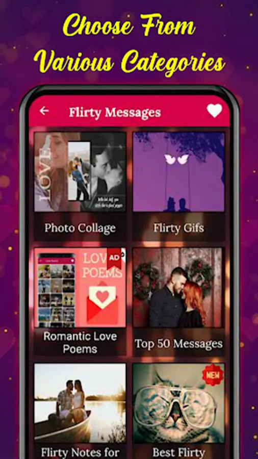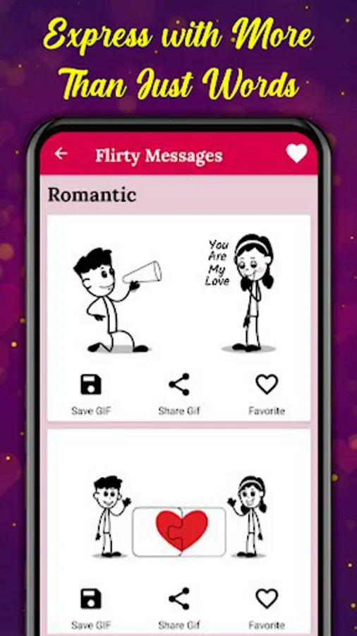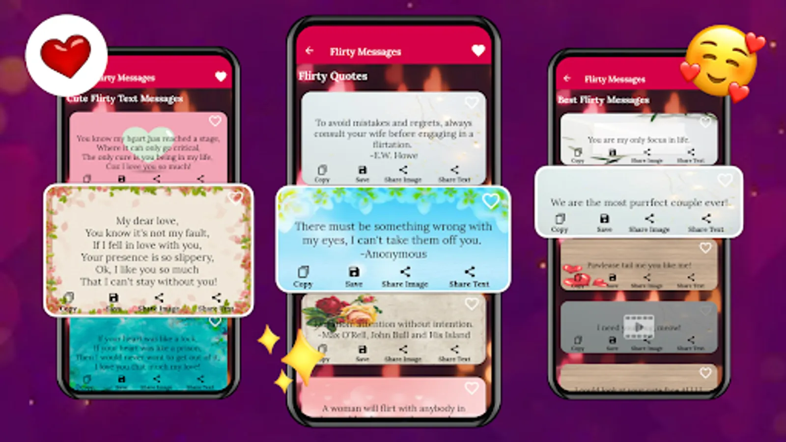 Want to chat with someone special but don't know how to begin? 'Flirty messages' is your savior! This app is filled with romantic, cute, and sweet messages which will surely impress your crush! You can share these lovely messages on Whatsapp, Facebook and more.