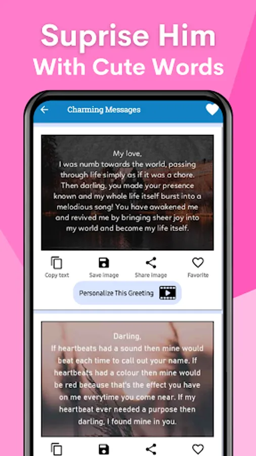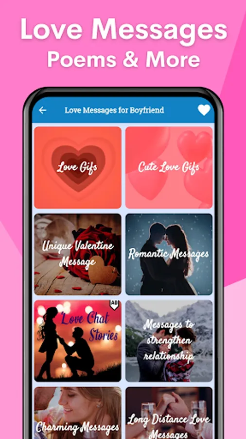 Love Messages For Bf is the perfect app for expressing your love to your boyfriend. With a wide range of categories, you can find the perfect Valentine's day notes, love messages for boyfriend, flirty text messages for him, poem, or gift to show him just how much you care.