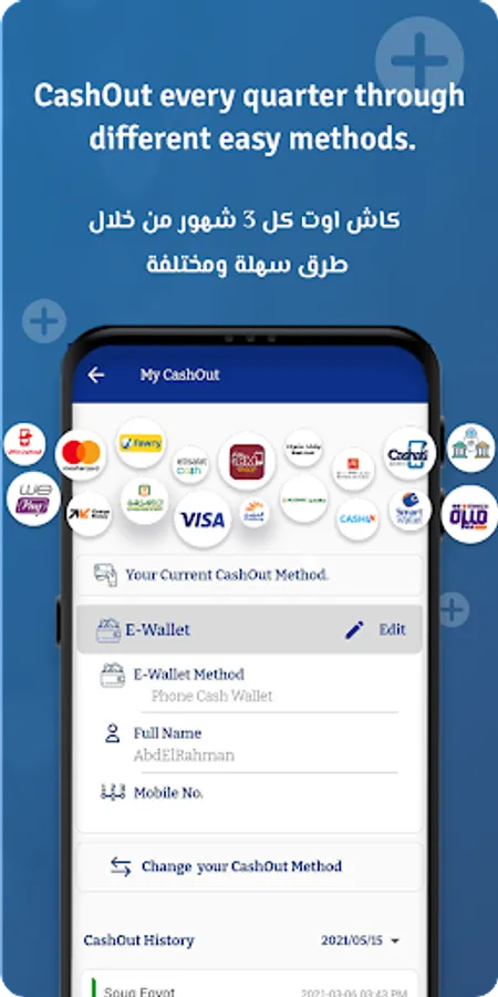 Withdraw your cash every 3 months on the scheduled CashOut day using one of our various CashOut methods, including bank transfers, Fawry, or E-wallets.
