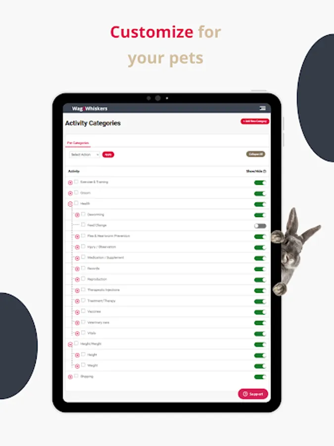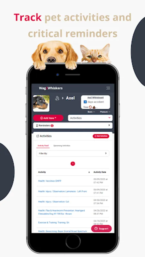 Track activities such as exercise and training, grooming, health, and weight changes.