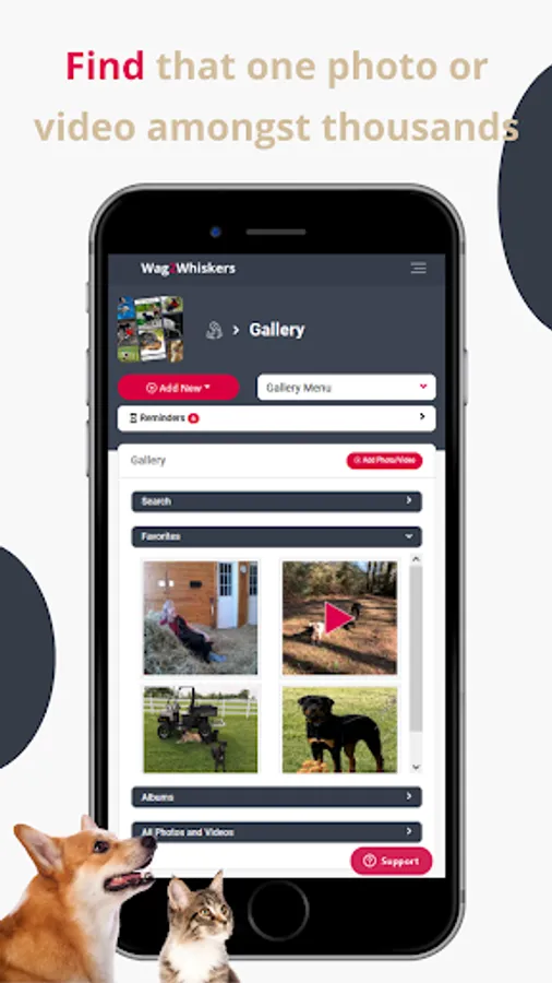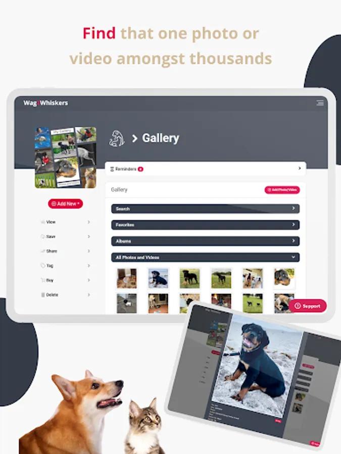 Load photos and videos in the Gallery and share them on social media or with your veterinarian. Automatically tag them with your pet, the date, the activity and custom tags so that you can find them quickly amongst your thousands.
