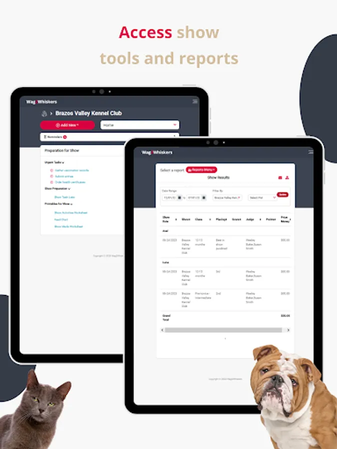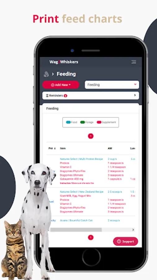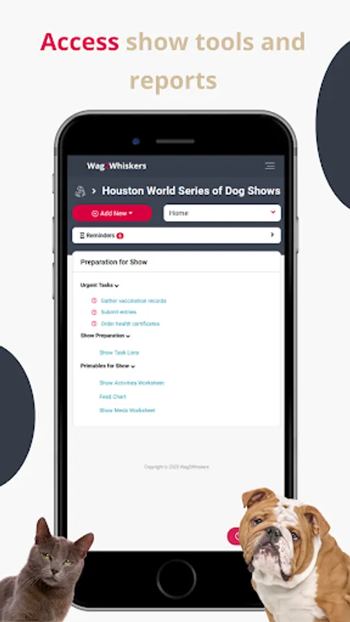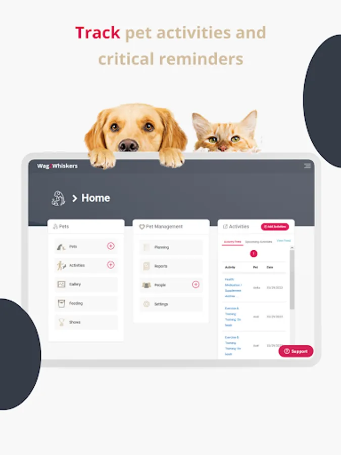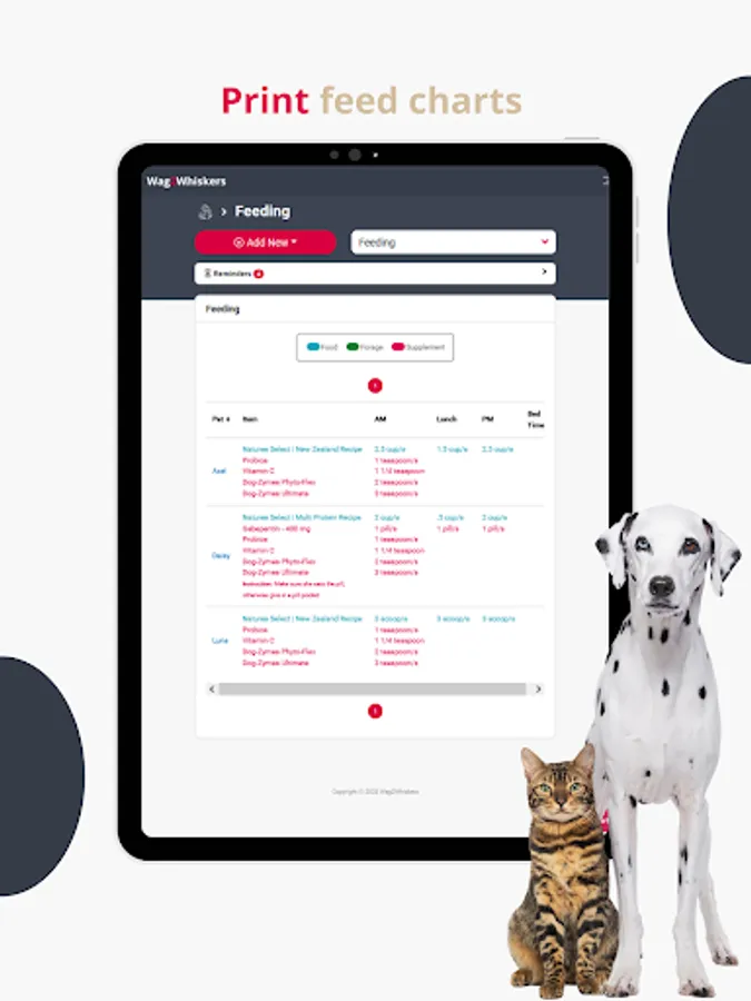 Wag2Whiskers has everything you need to stay organized and get the most joy out of your wagging tails and ticklish whiskers. From dogs to cats and alpacas to zebras…and every pet in between… keep health records, activities, training and exercise, photos and videos, reminders, show prep and results, feed charts and planning all in one place.