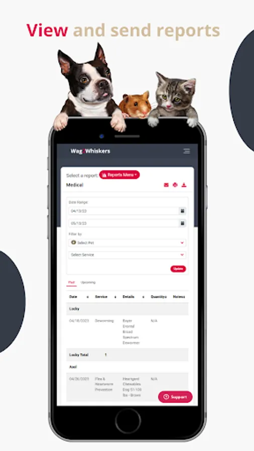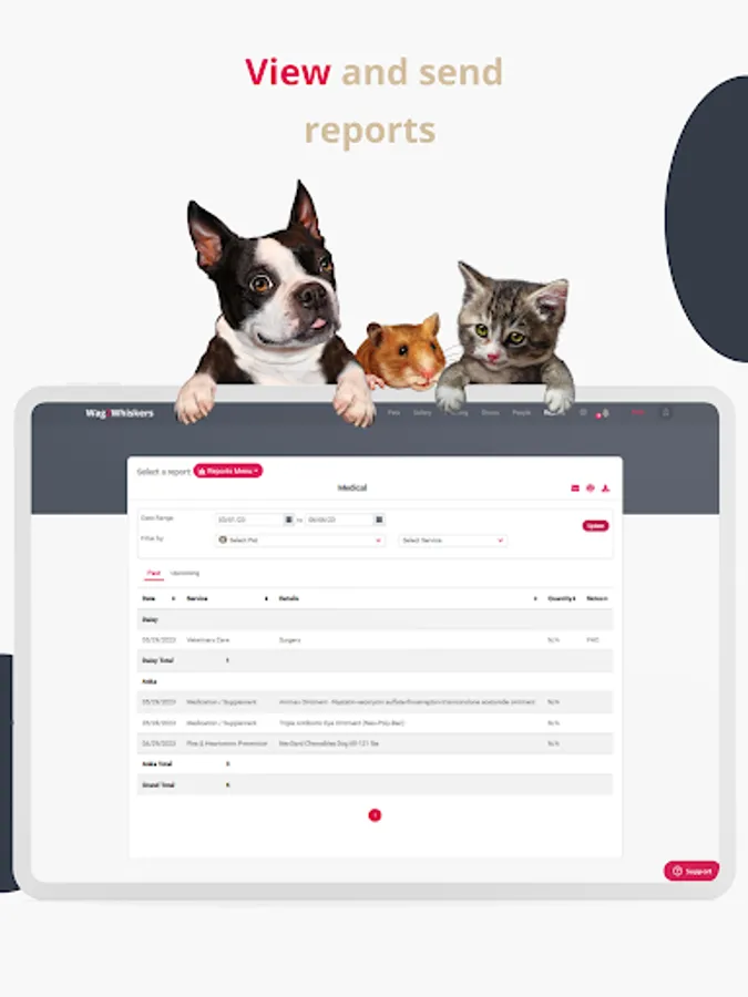 Run a multitude of reports: activities and medical and share with your veterinarian.