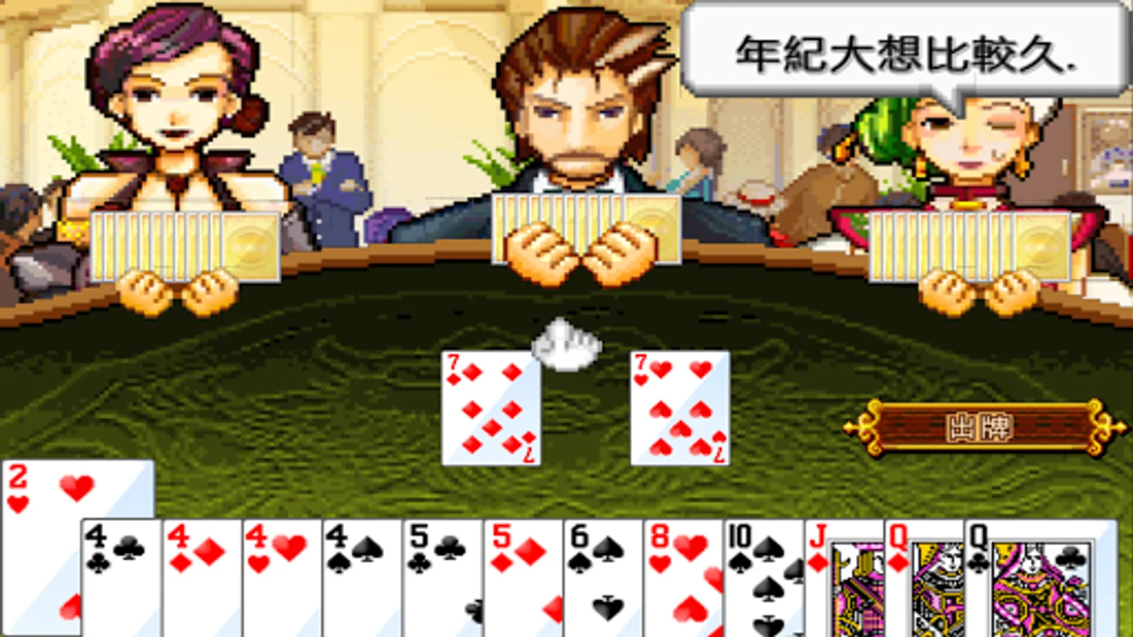 “Fan-tan” is playing for 4 persons, each one gets 13 cards. “Spade 7” goes at first, and other cards deal according to number. If you could not deal, then covered a card and passed. The winner is the least one who covered cards.
