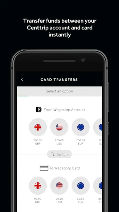 • Transfer funds to and from your wage|corp Centtrip multi-currency Mastercard®