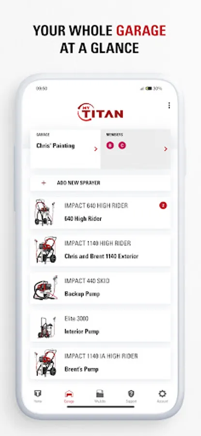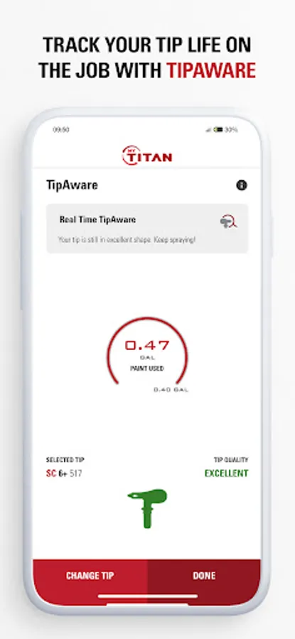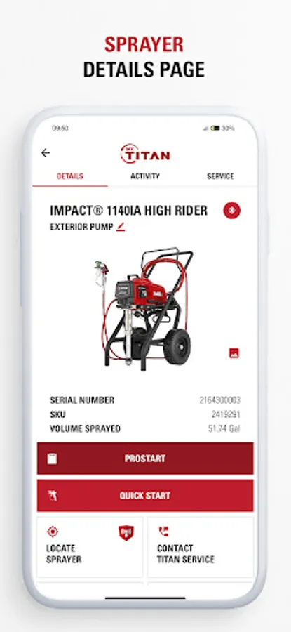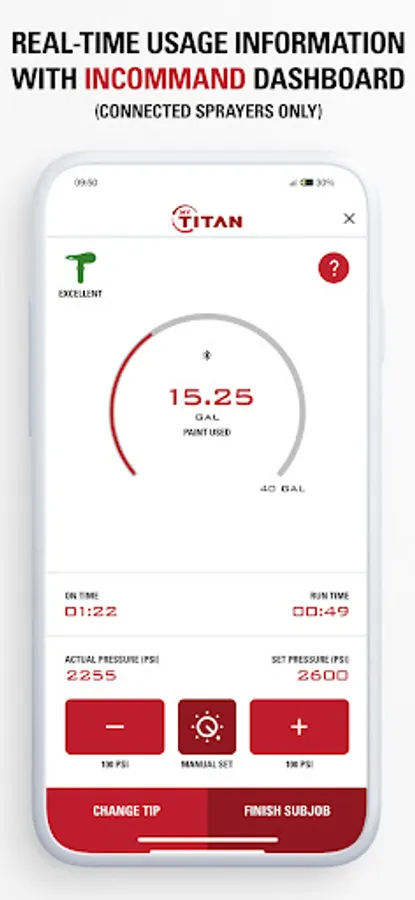 • Get real-time usage data from your connected Titan sprayer including: Material Usage, Operating Time, and Pressure Settings