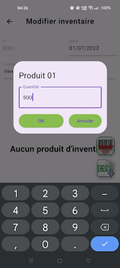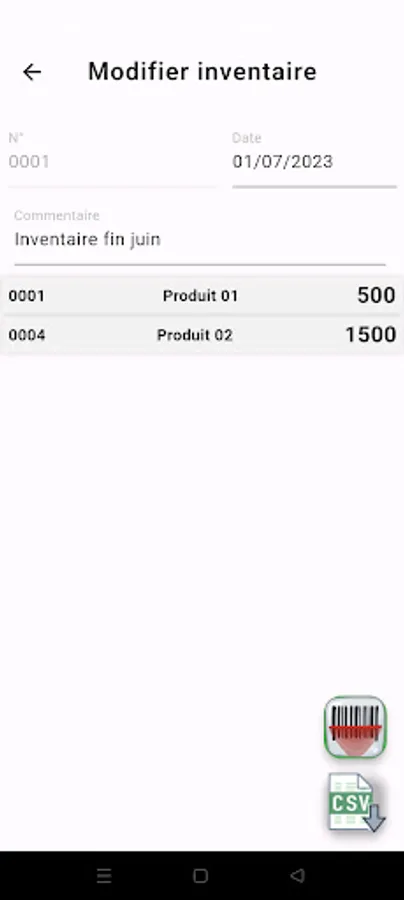 In summary, our application offers you a practical solution to manage your inventories by simply using your smartphone. Easily import your product listings via a CSV file, take inventory by scanning barcodes with your phone's camera, and share the results as Excel-compatible CSV files. Simplify your inventory process and save valuable time with our intuitive and user-friendly app.