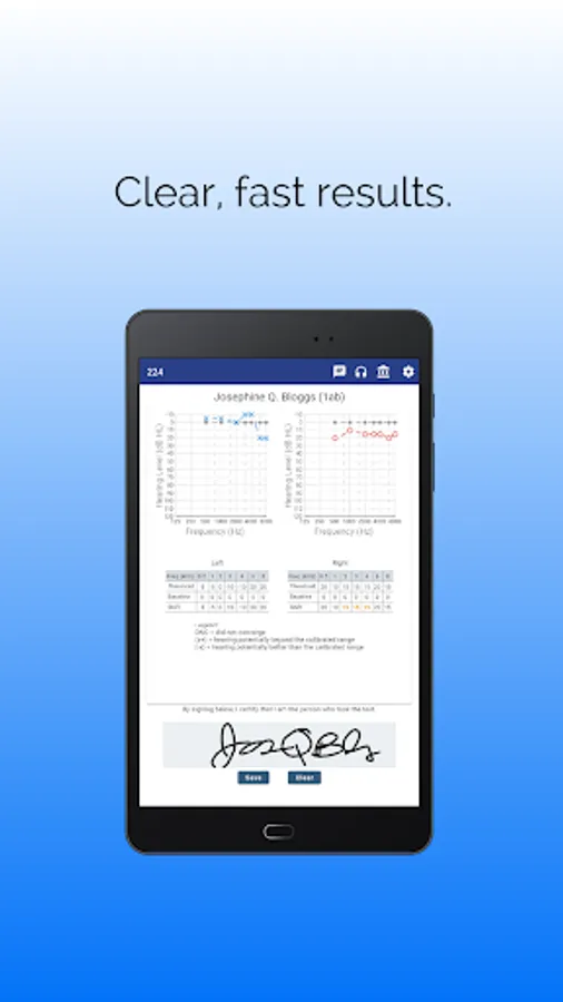 • Presents hearing test results graphically (audiogram) and numerically (table)