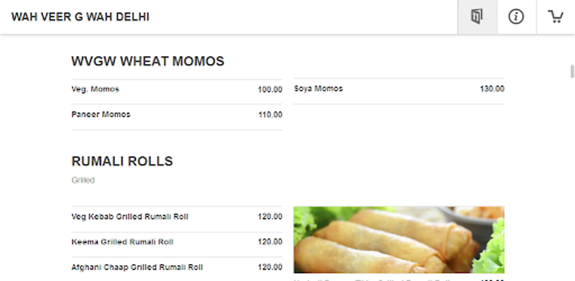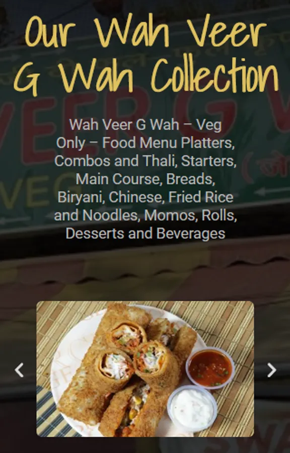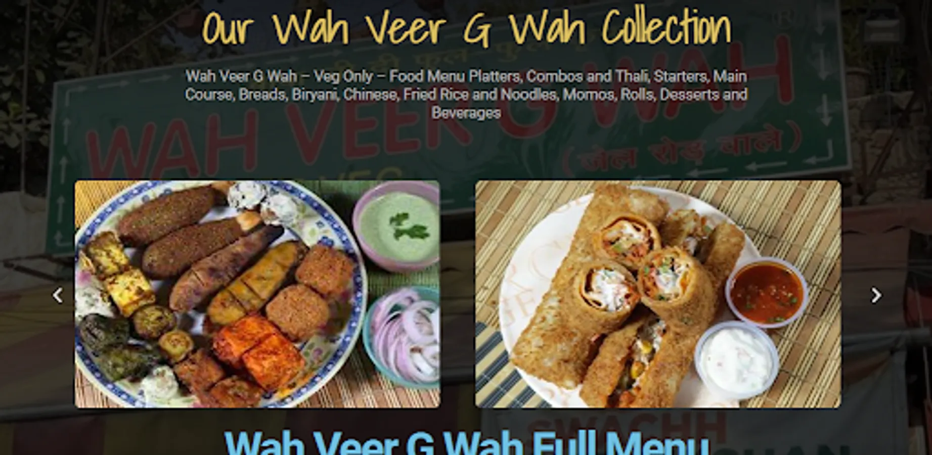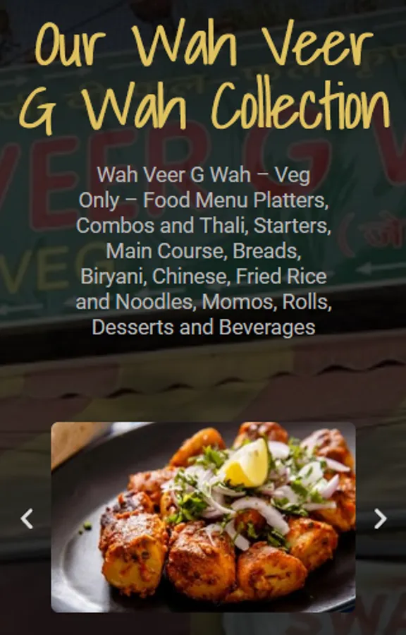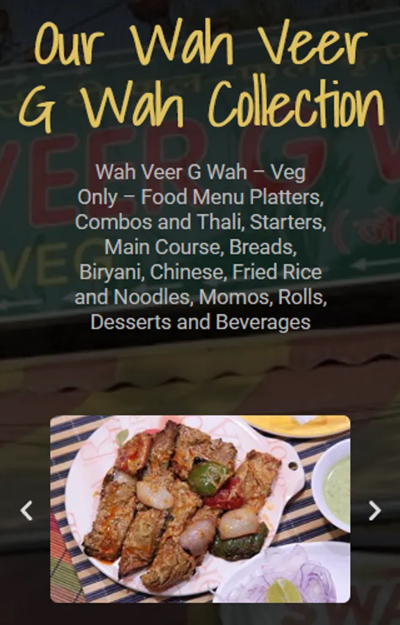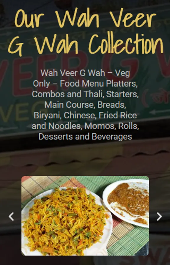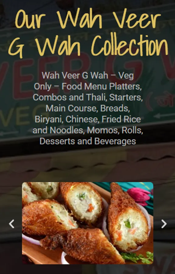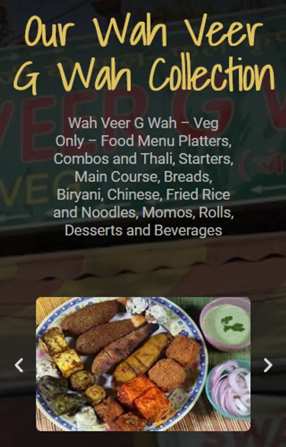 Wah Veer G Wah – Veg Only – Food Menu Platters, Combos and Thali, Starters, Main Course, Breads, Biryani, Chinese, Fried Rice and Noodles, Momos, Rolls, Desserts and Beverages
